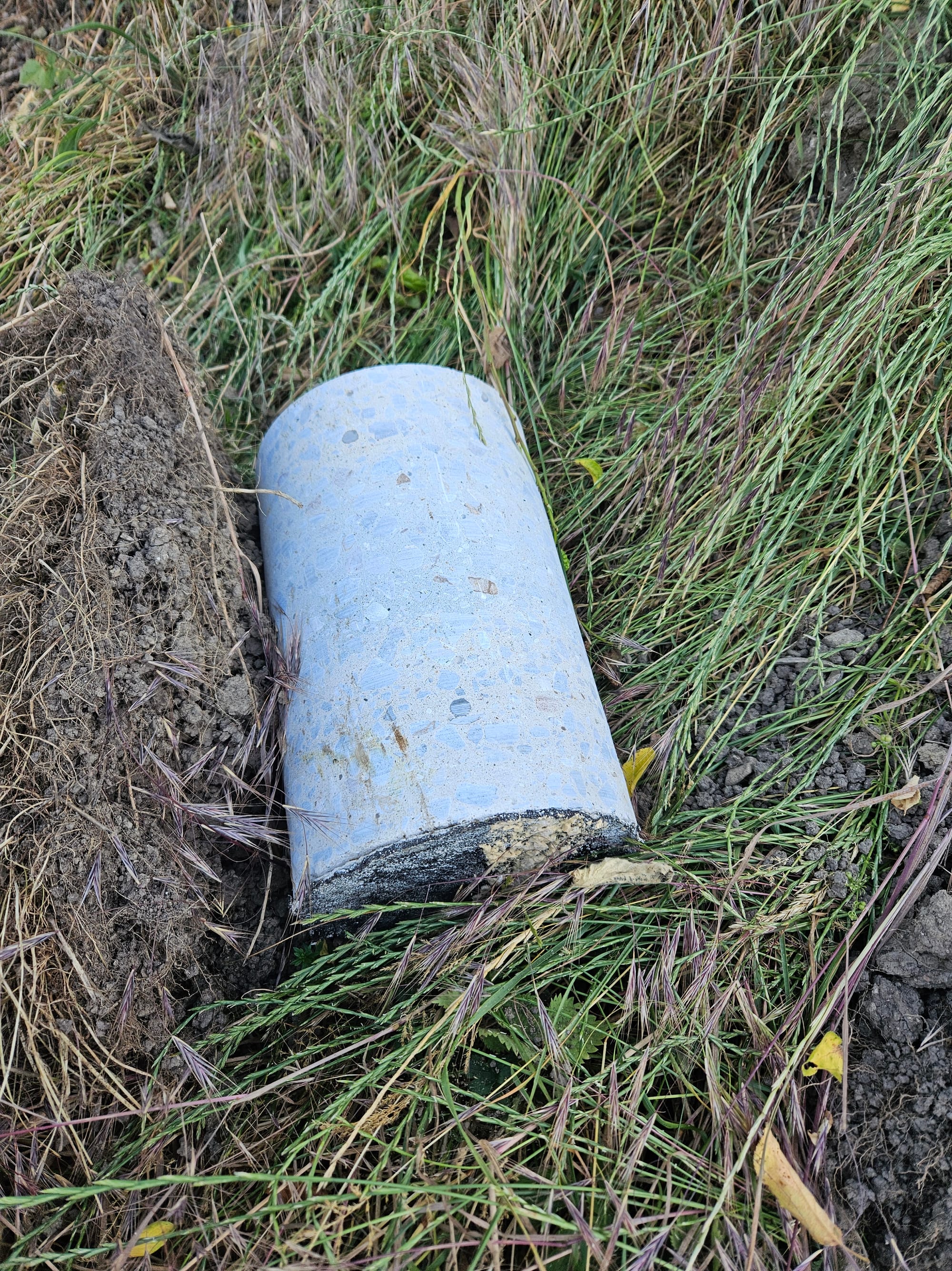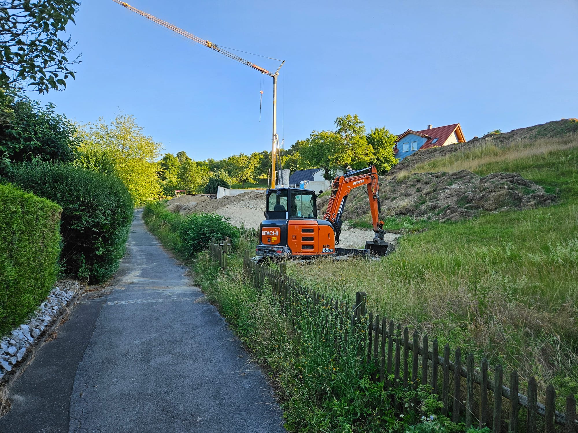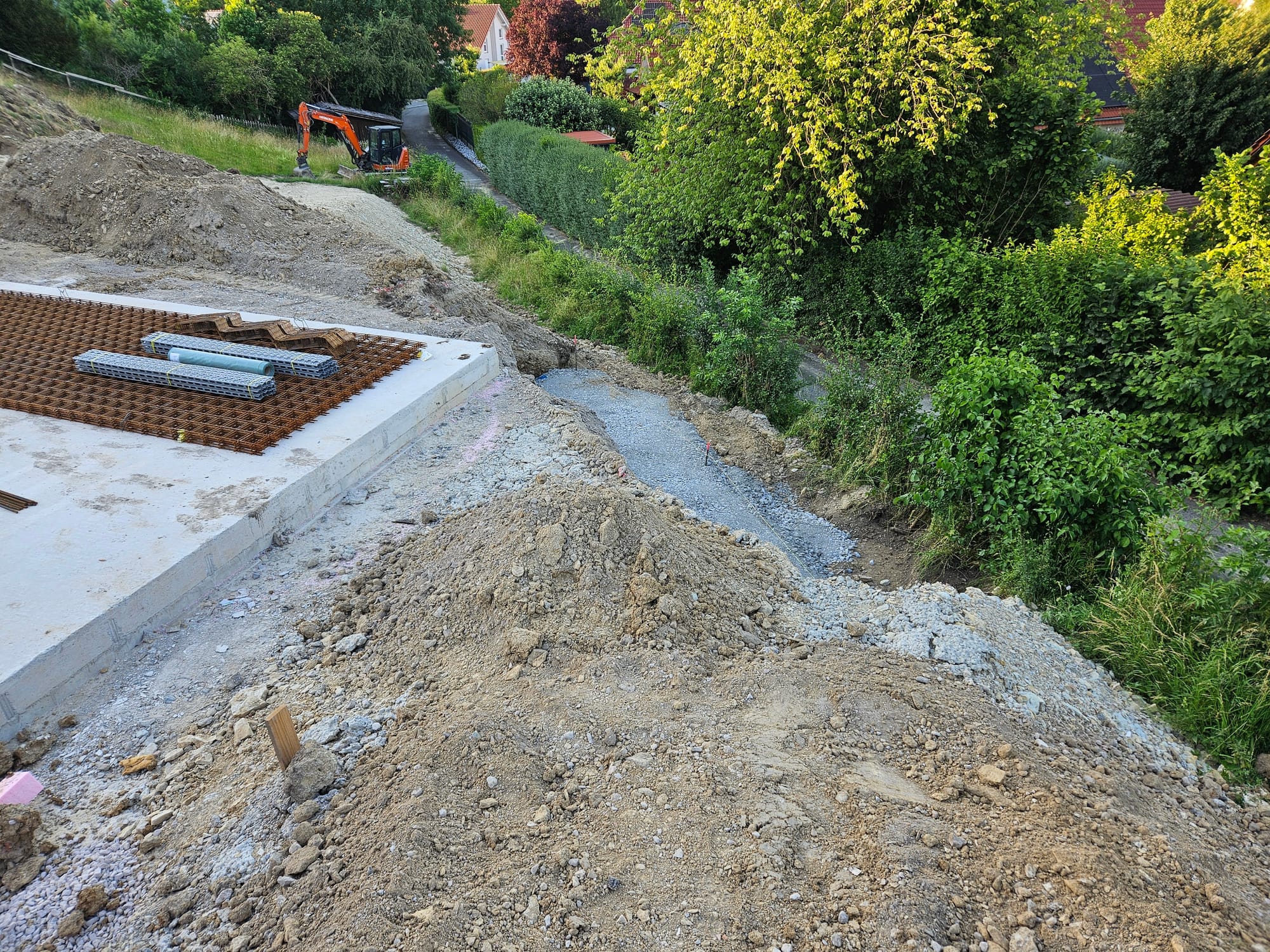 - Untergrund für die L-Steine wurde vorbereitet. Die Position wurde markiert, ist aber nicht passend. Wir haben die Position neu markiert und an den Baggerfahrer kommuniziert