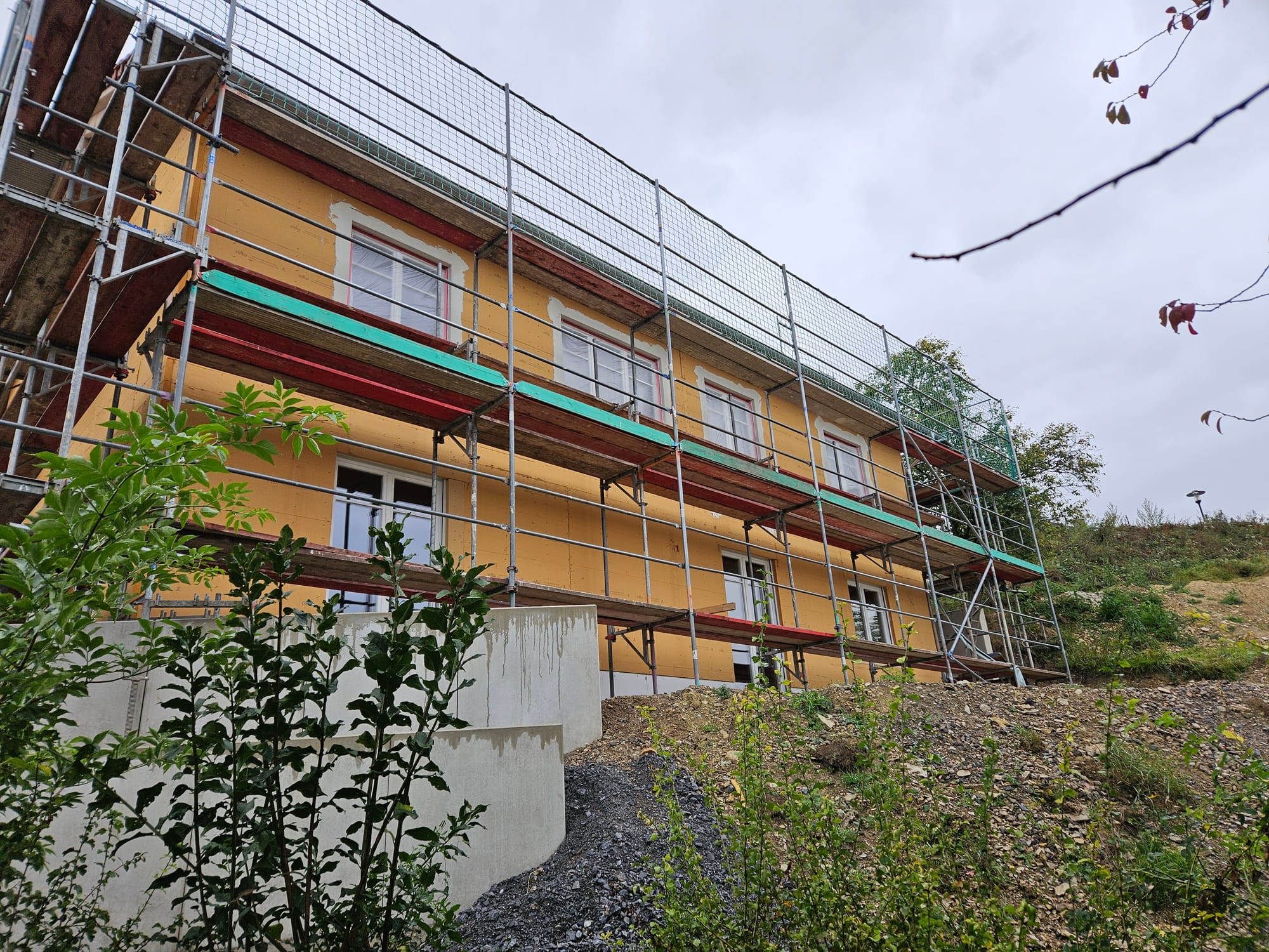 - Die Verputzer kleben die Fenster ab und bringen Armierung an