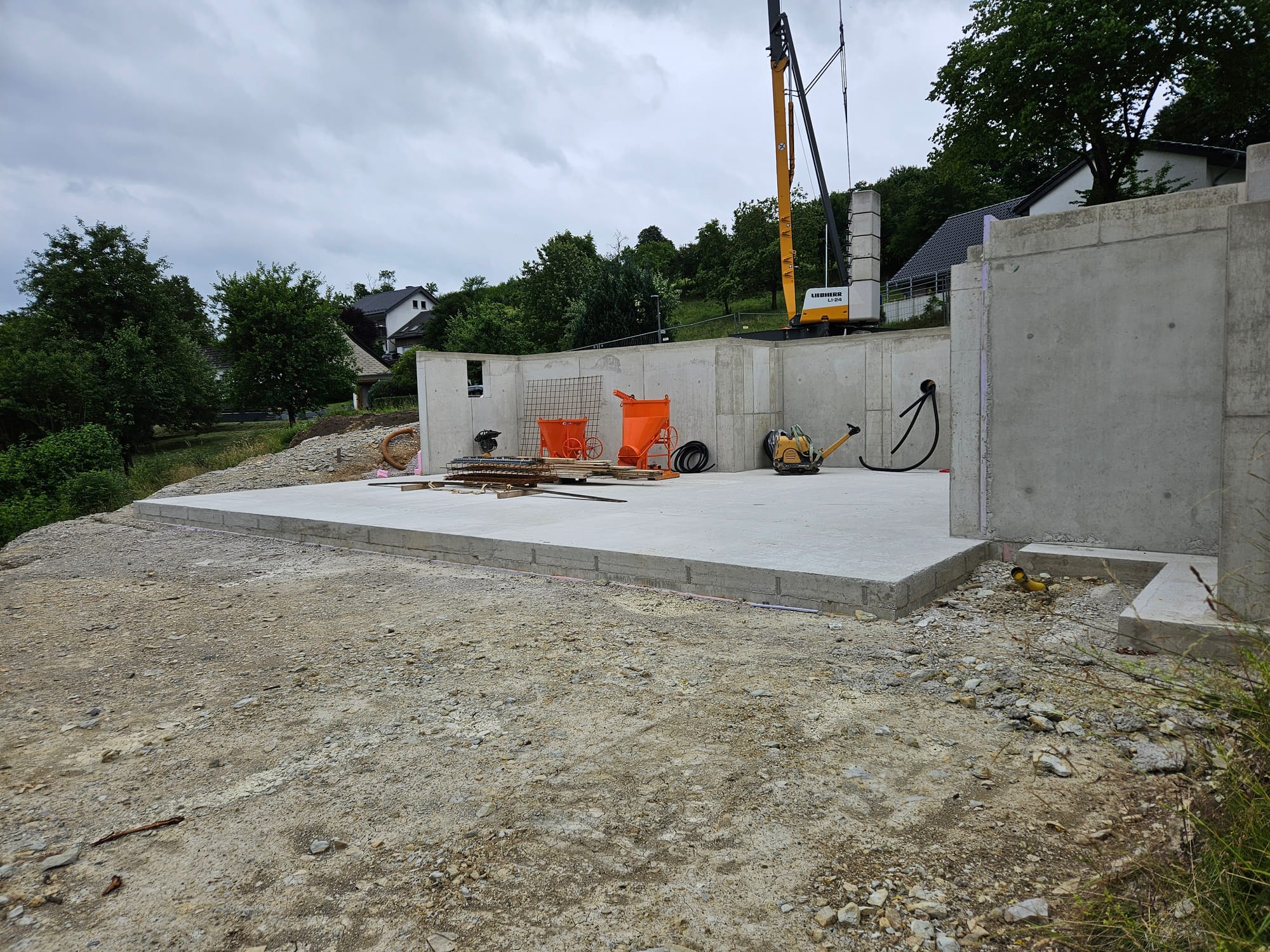 Erdarbeiten haben wieder begonnen. Wir treffen uns auf dem Grundstück um die L-Steine an der Hausecken zu besprechen. Das muss nun als nächstes passieren sonst rutscht uns der Hang ab.
