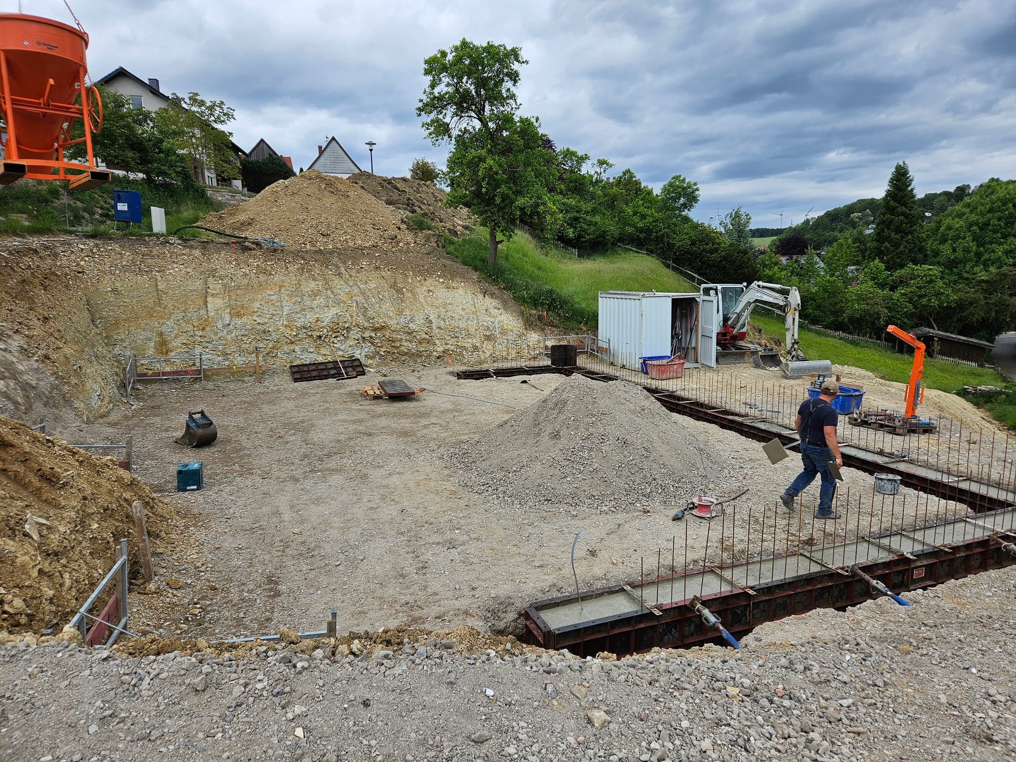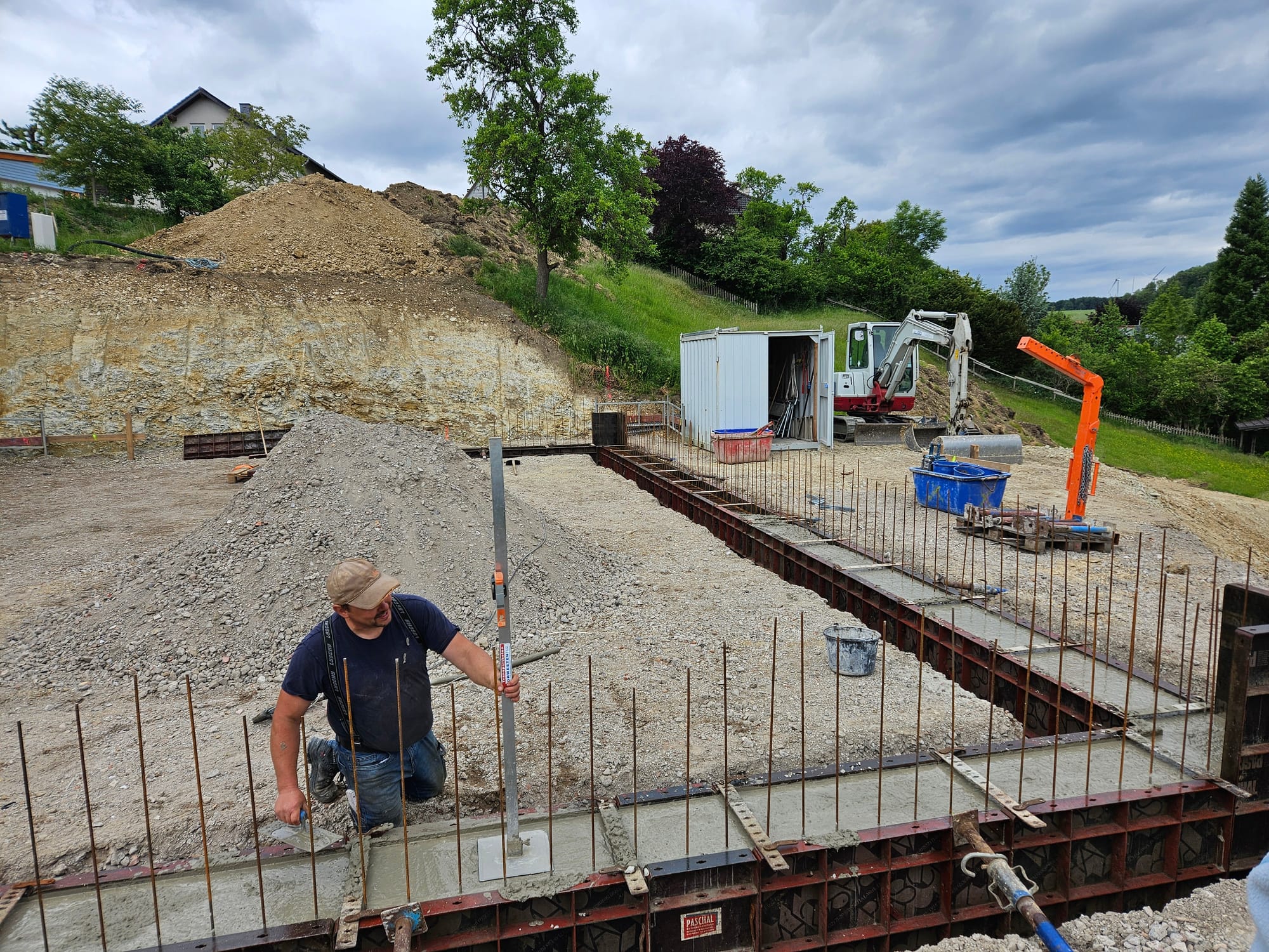 - Streifenfundamente im vorderen Bereich wurde eingeschalt, Armierung eingelegt und mit Beton gefüllt.