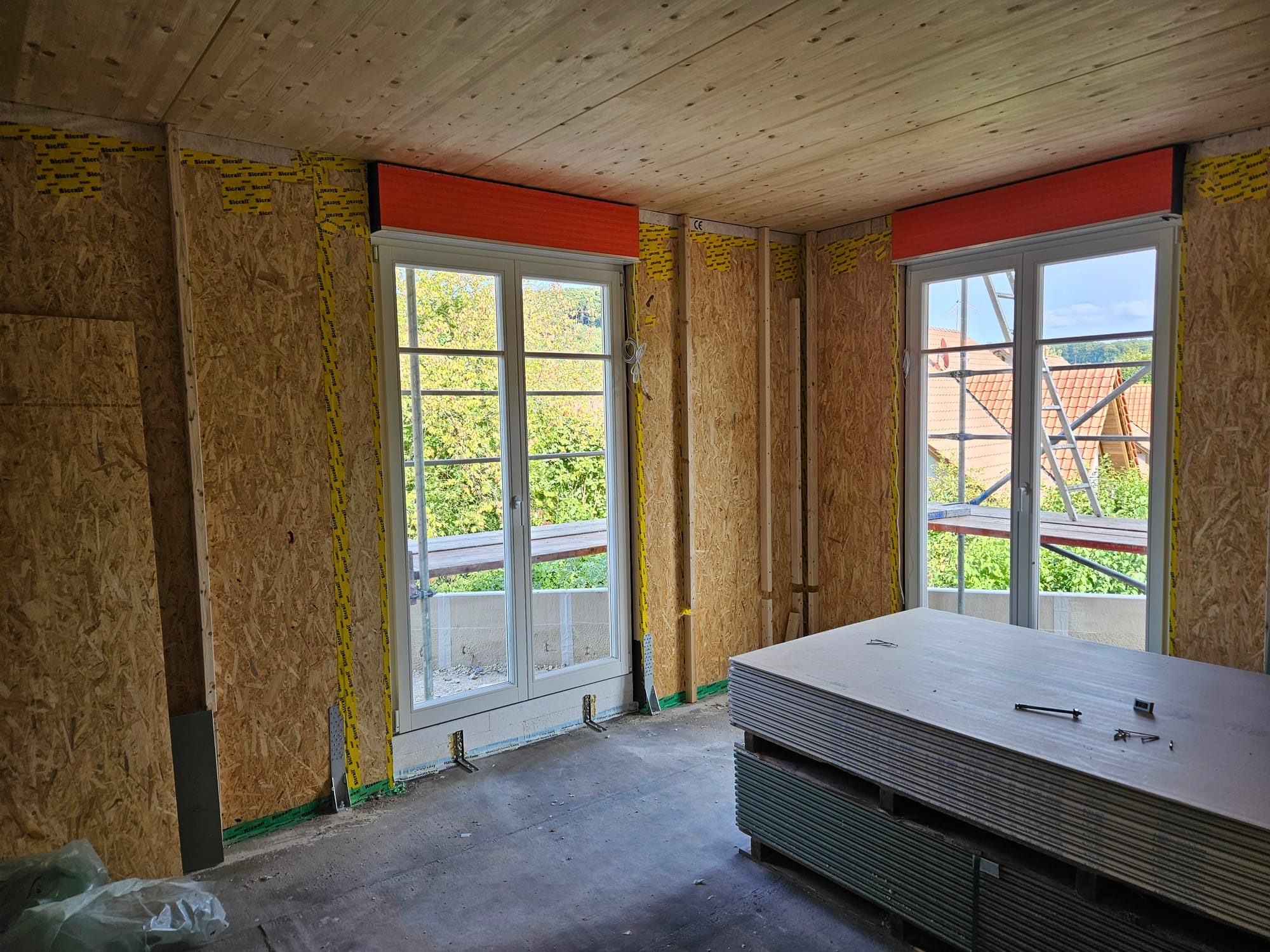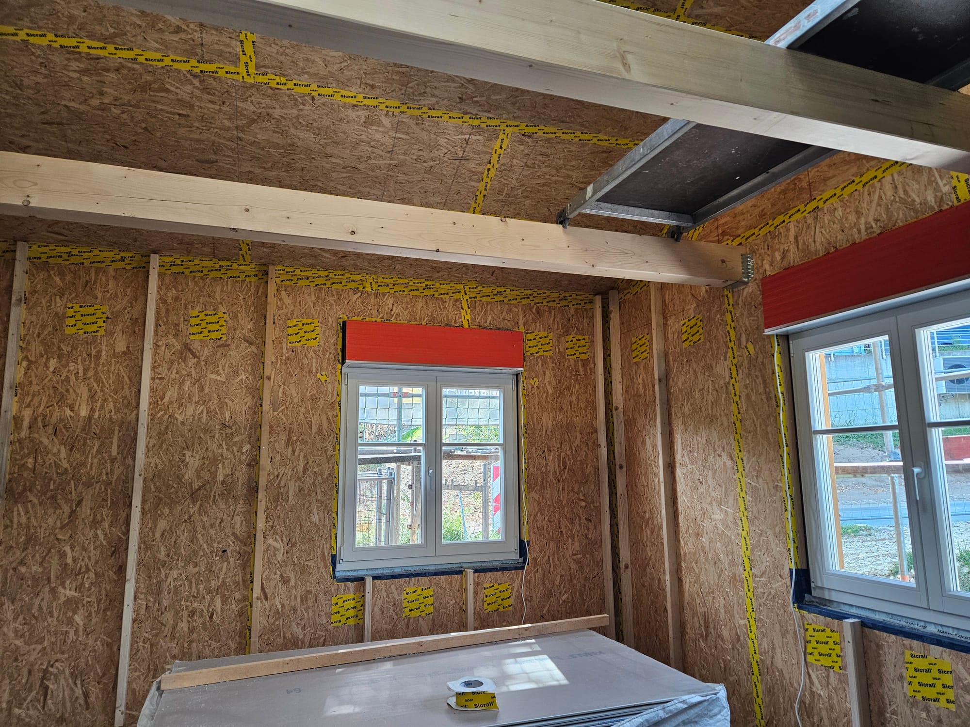 Es geht weiter. Was ist passiert? * Büro final Q2 gespachtelt * Gäste Decke zum 2. Mal lasiert * Keller grundiert * An der Holzfassade im Eingang wurde weiter gearbeitet Welche Firmen waren vor Ort? * Wir * Zimmerei Sonstiges * Sonstiges