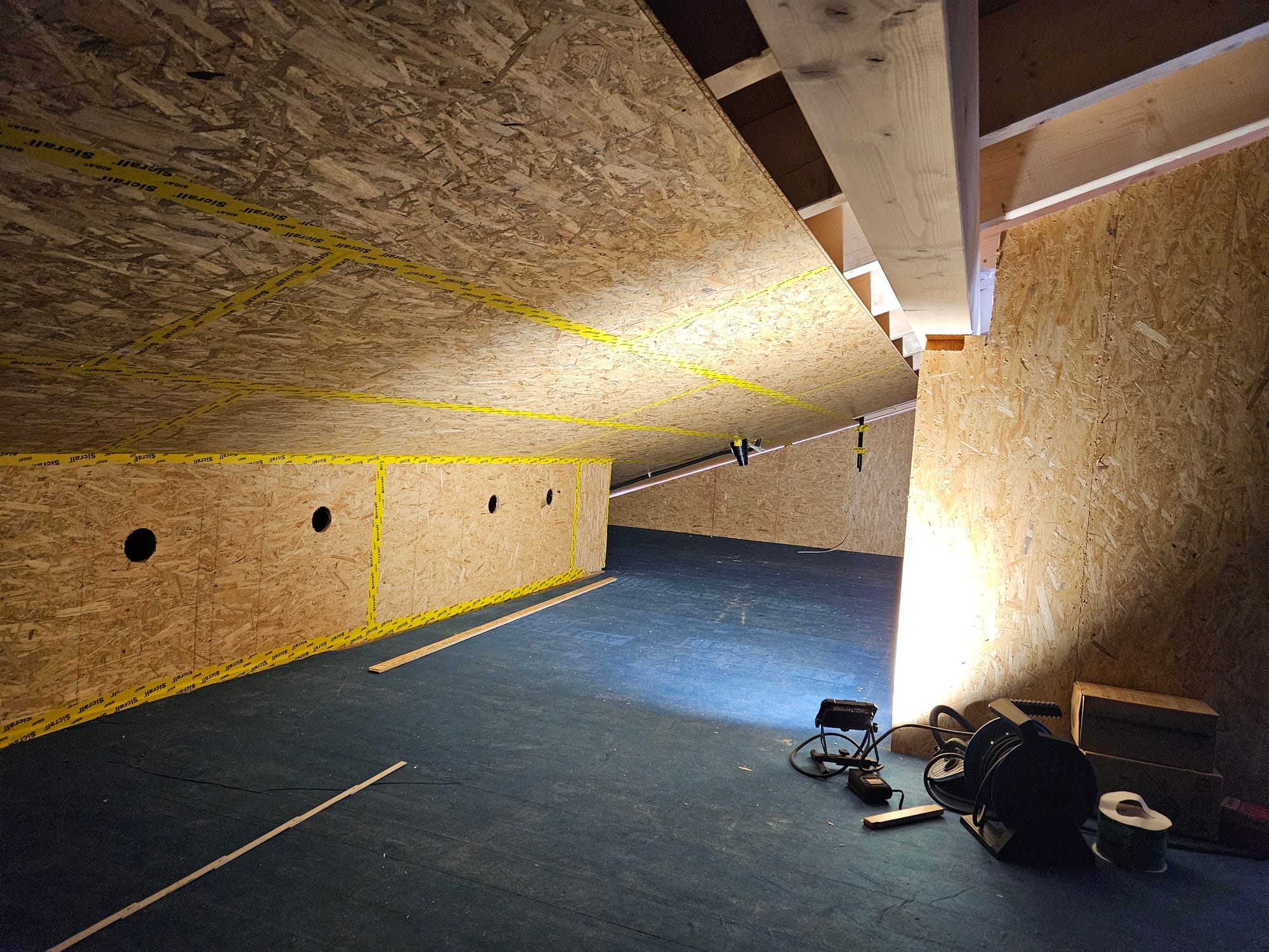 - Wir legen beplanken weitere Reihen OSB Platten an der Süd-Decke