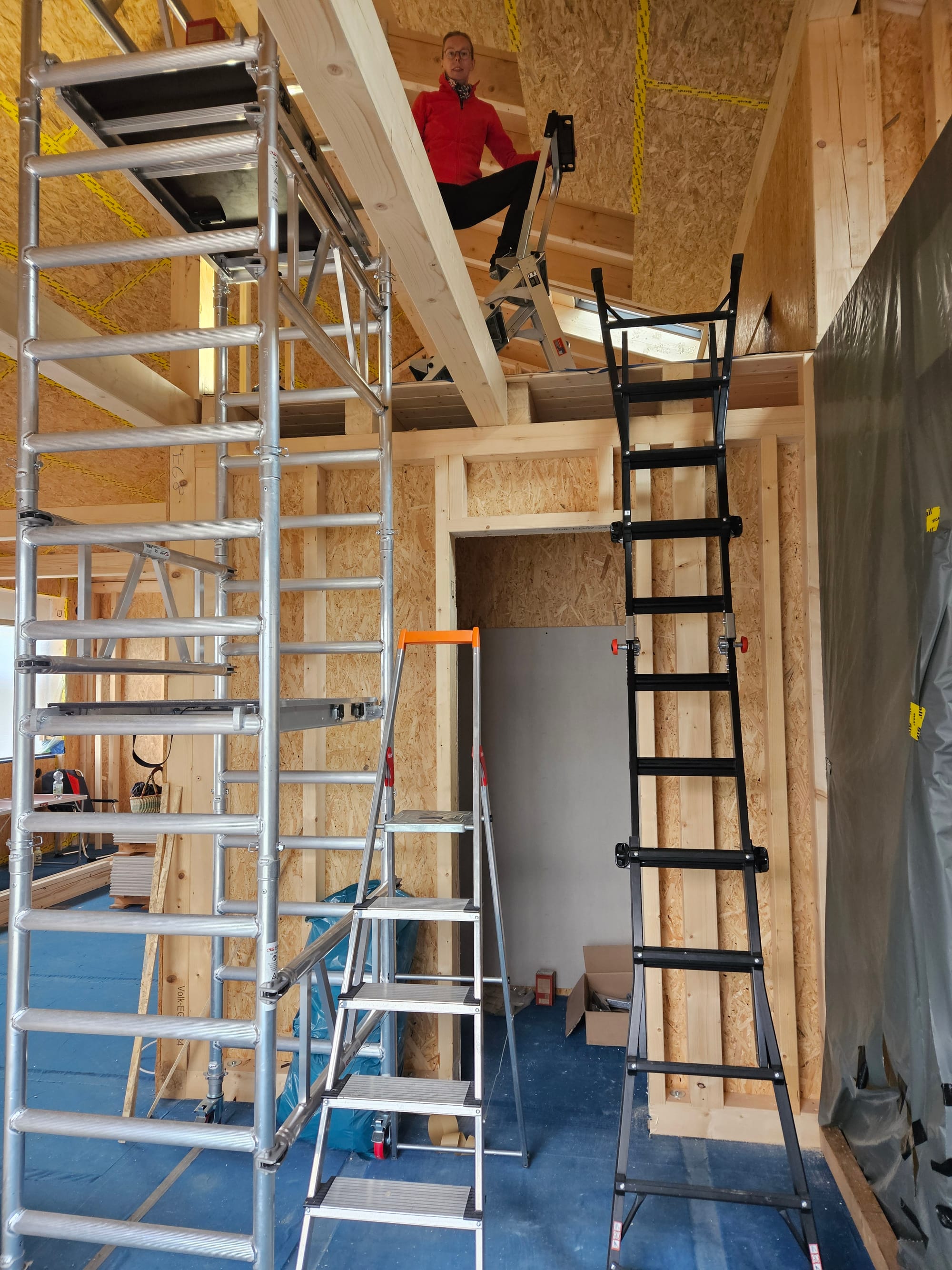 Es geht weiter. Was ist passiert? * Büro final Q2 gespachtelt * Gäste Decke zum 2. Mal lasiert * Keller grundiert * An der Holzfassade im Eingang wurde weiter gearbeitet Welche Firmen waren vor Ort? * Wir * Zimmerei Sonstiges * Sonstiges