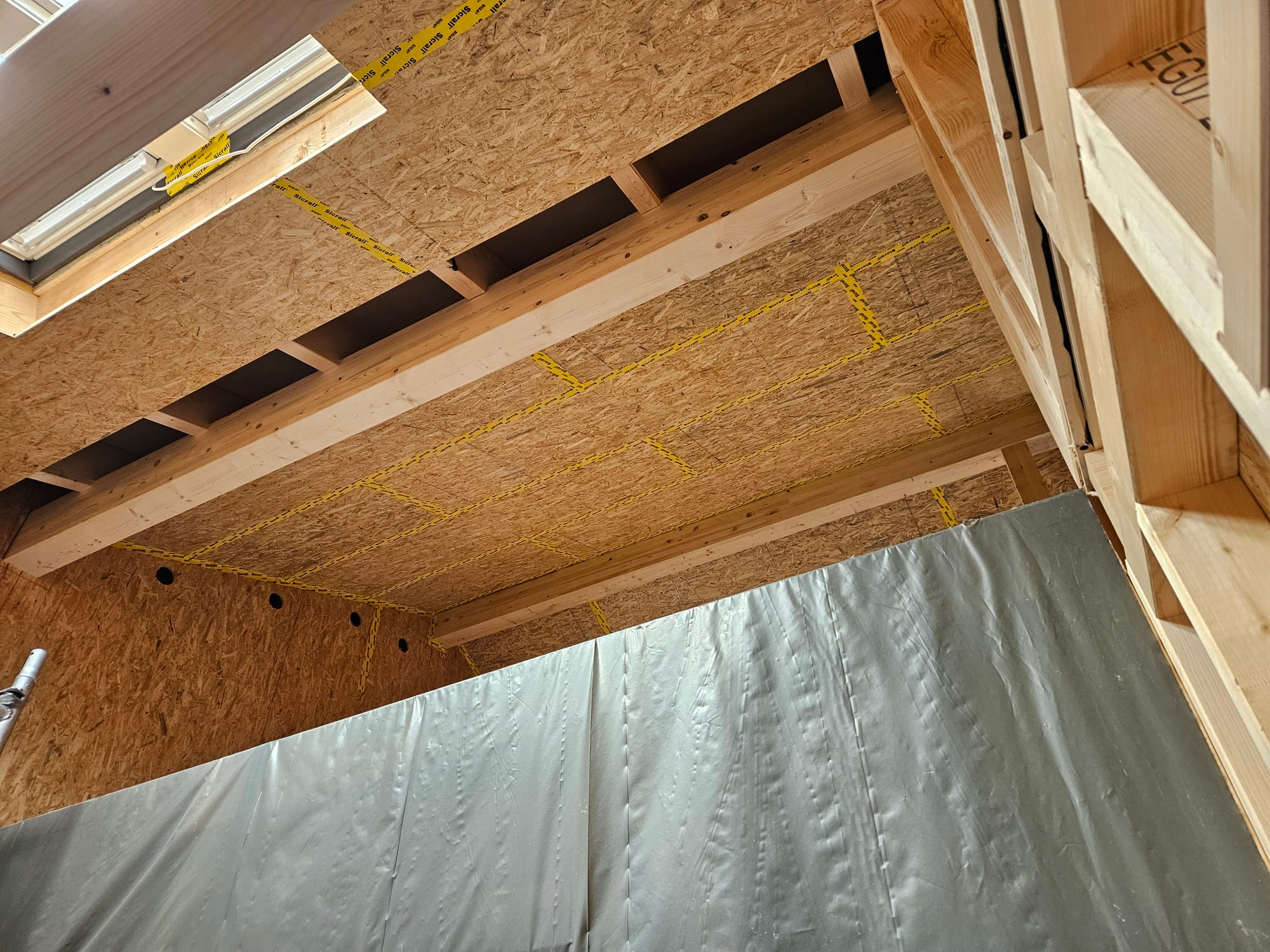 Der große Luftraum am südlichen Dach wird innen mit OSB beplankt.