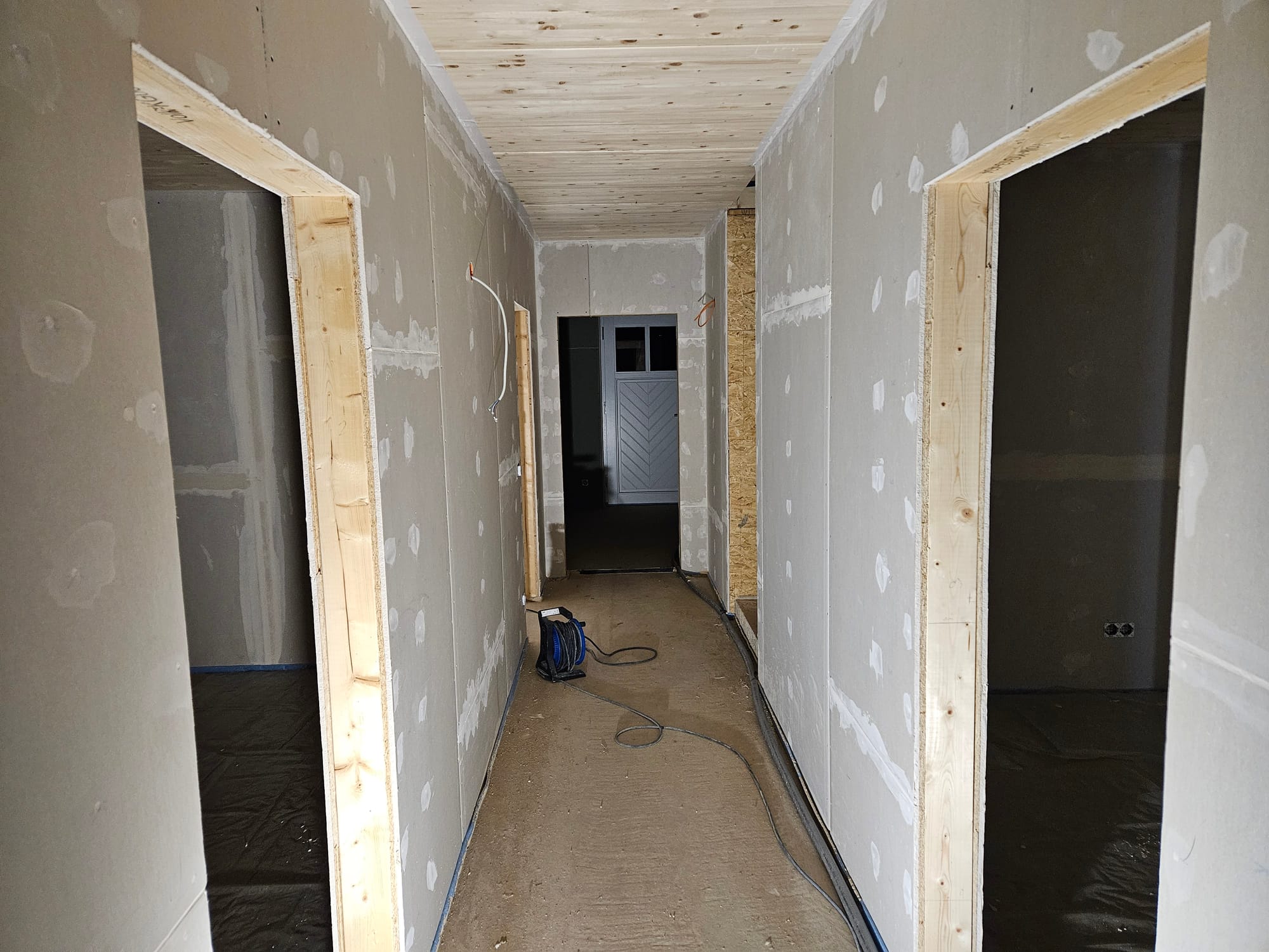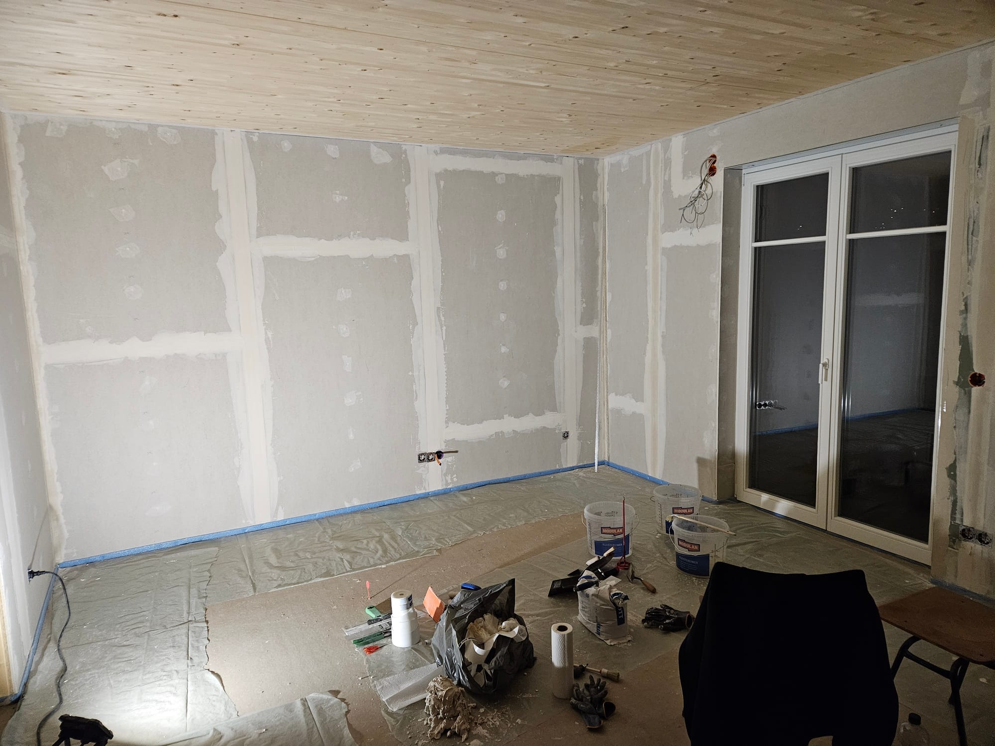 Wir streichen den ersten Raum mit Lehmfarbe. Was ist passiert? * Gäste mit Lehmfarbe gestrichen * Büro final Q2 gespachtelt * Flur final Q2 gespachtelt * Waschküche Q1 gespachtelt * Außenfühler Heizung gebohrt Welche Firmen waren vor Ort? * Wir Sonstiges * Sonstiges