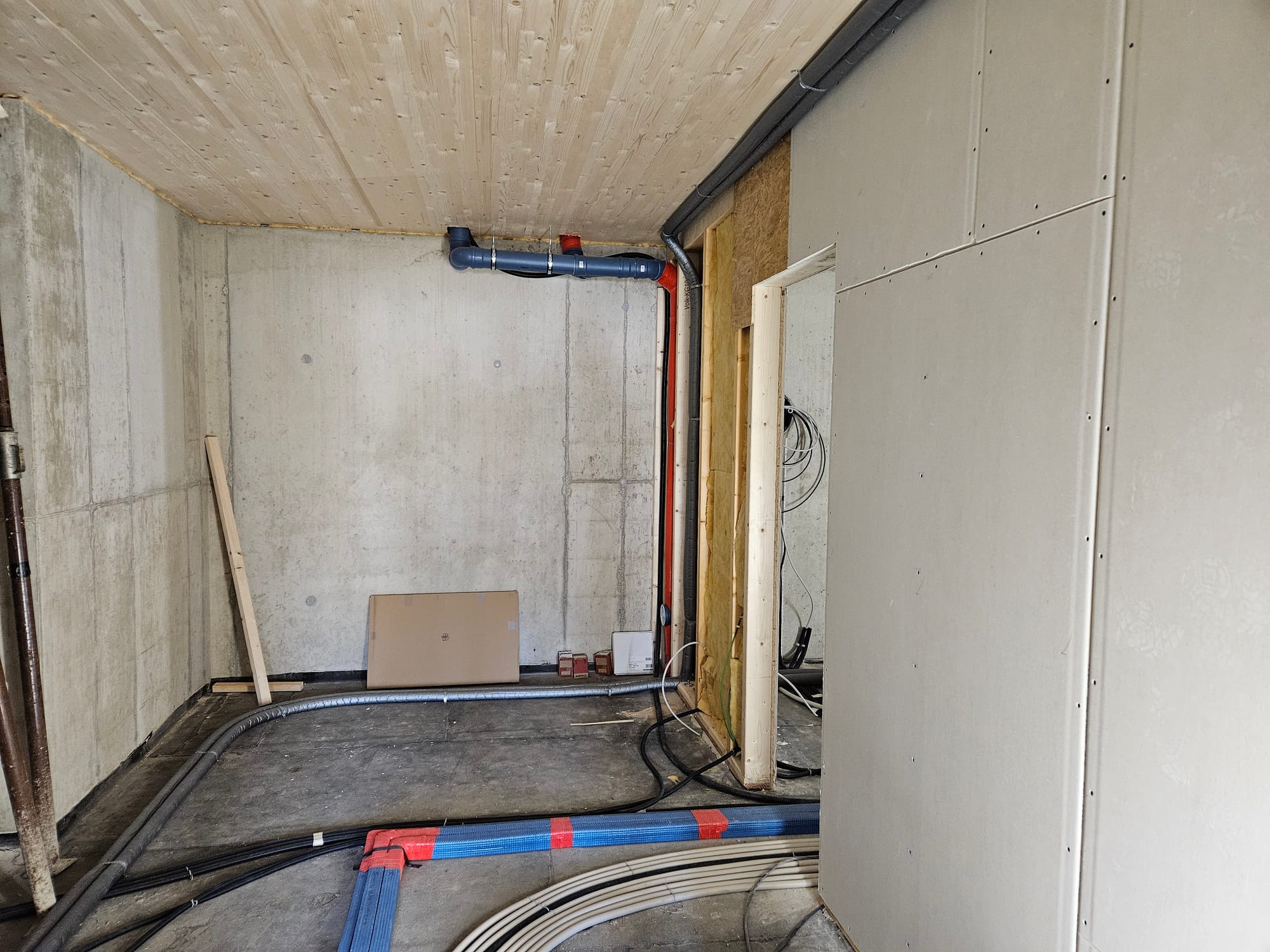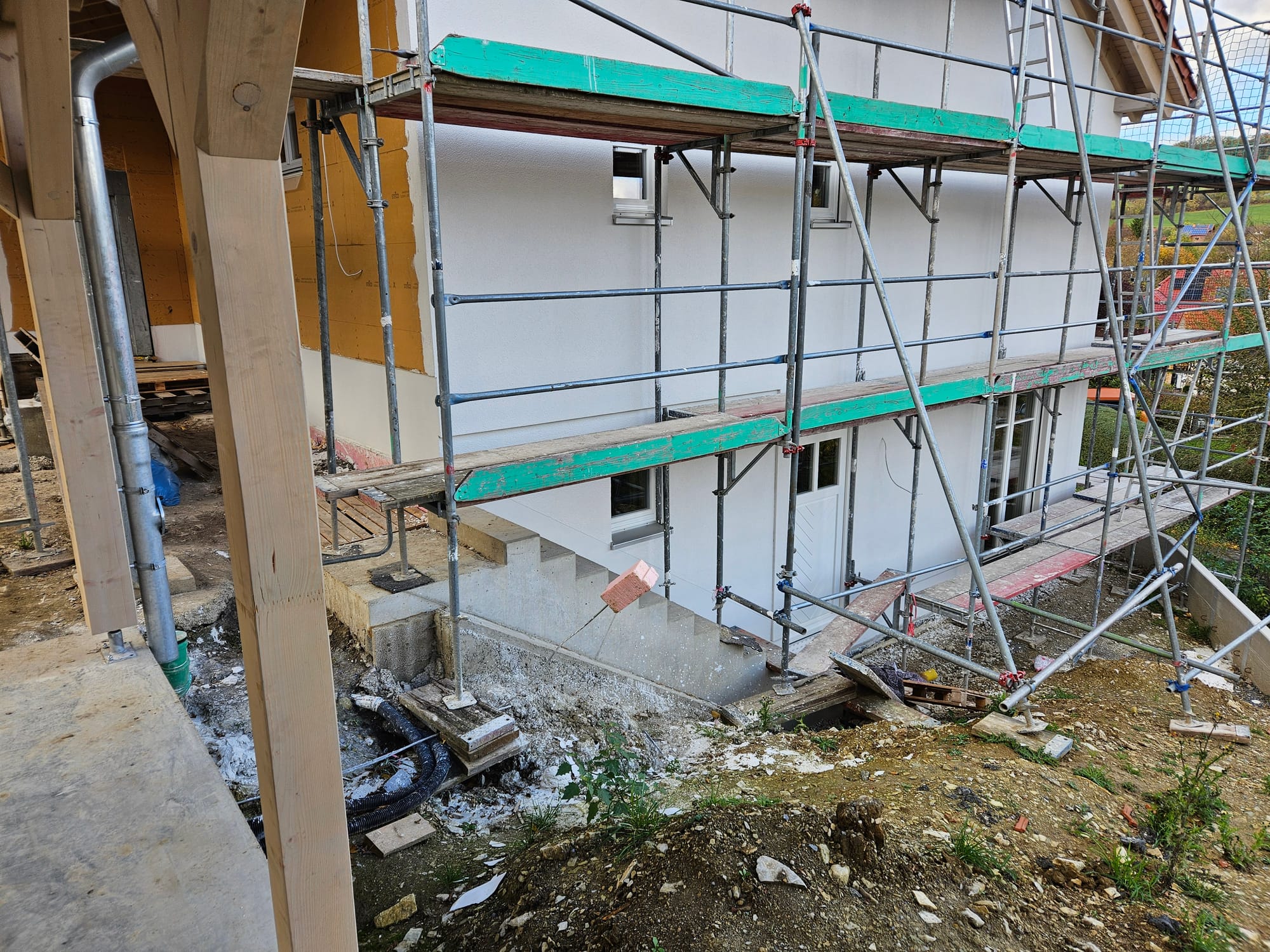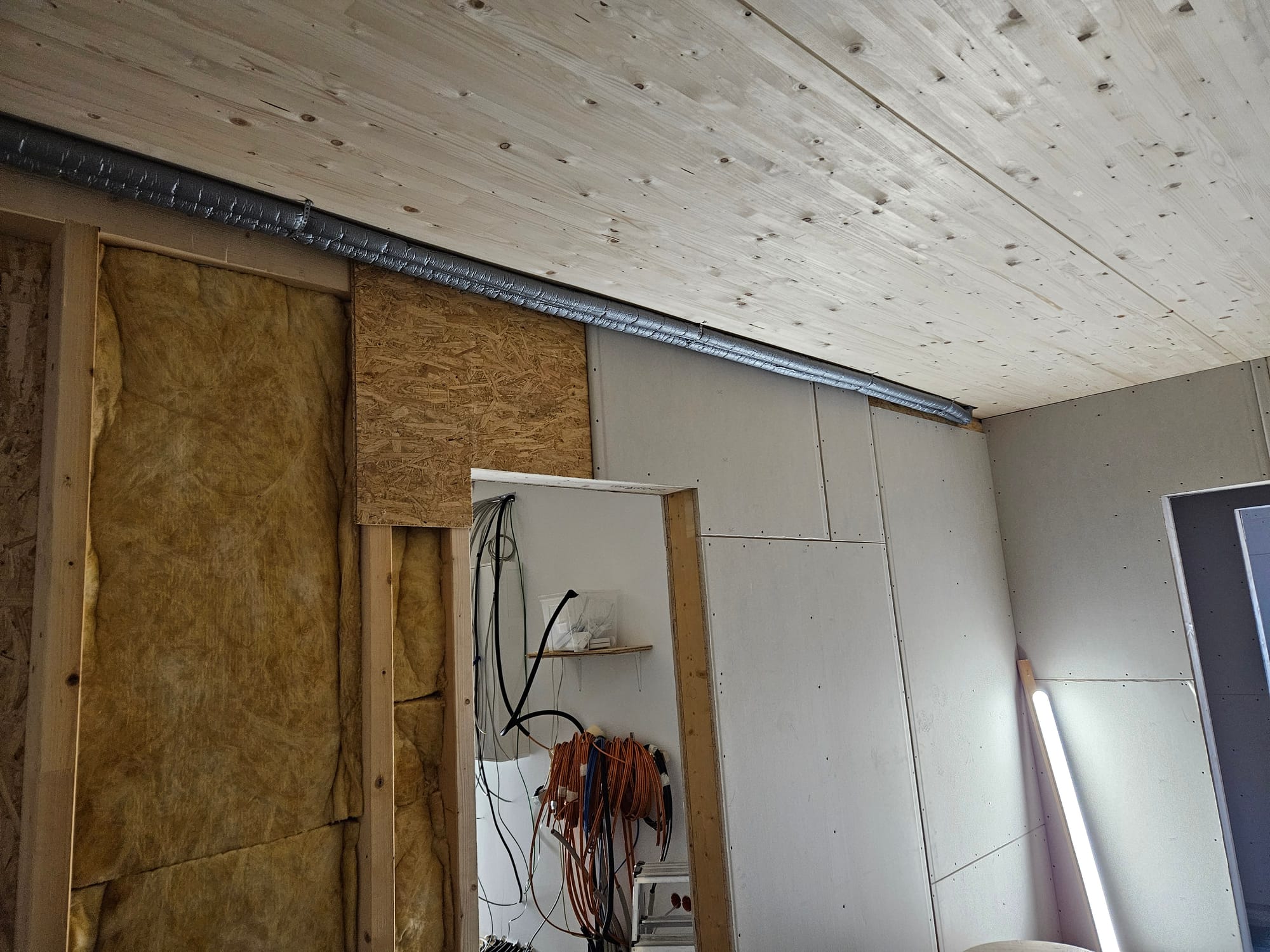 Es geht weiter. Was ist passiert? * Büro final Q2 gespachtelt * Gäste Decke zum 2. Mal lasiert * Keller grundiert * An der Holzfassade im Eingang wurde weiter gearbeitet Welche Firmen waren vor Ort? * Wir * Zimmerei Sonstiges * Sonstiges
