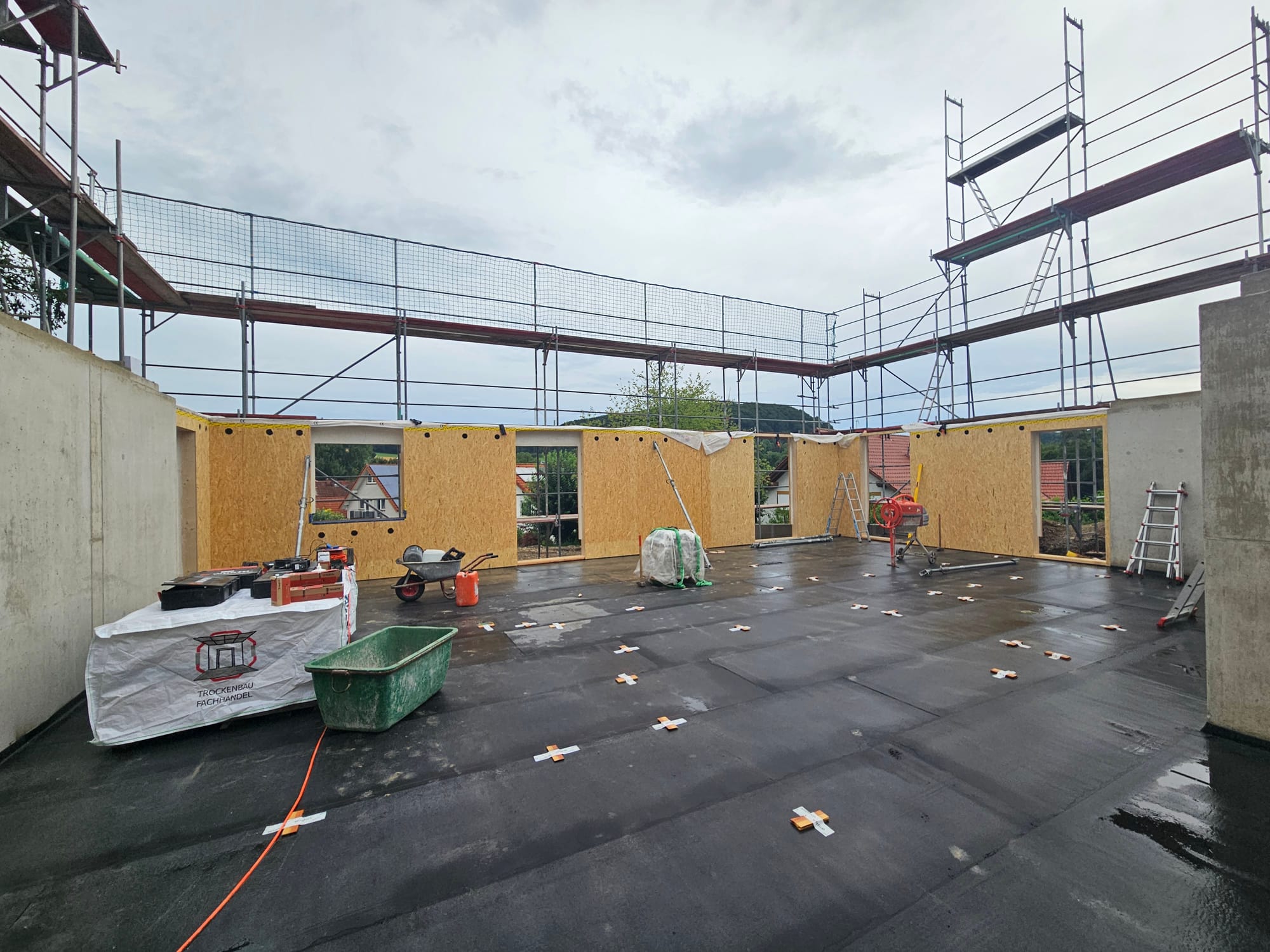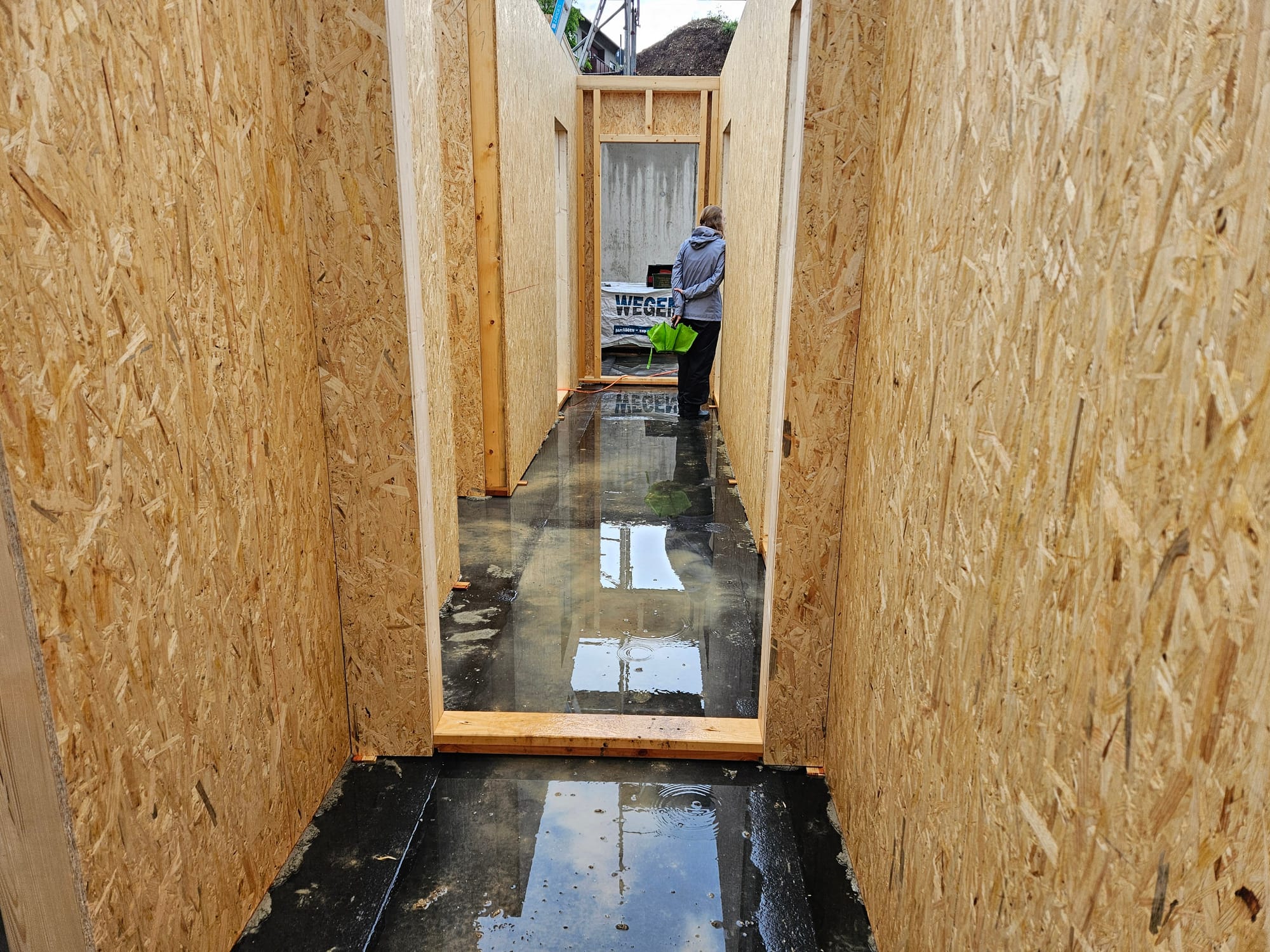 - In der Nacht hat es geregnet.Am Morgen entfernen wir alles Wasser von der Bodenplatte