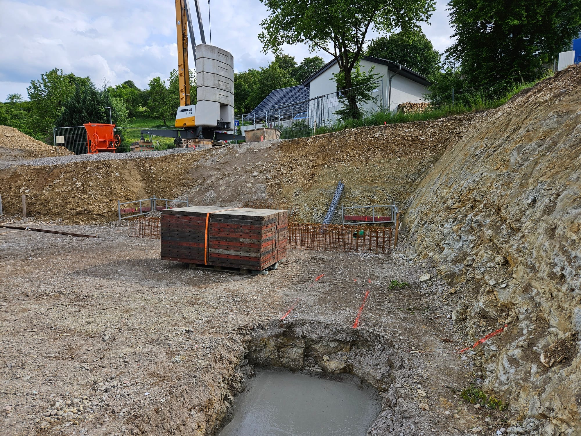 Der Kellerbau wurde begonnen. Der erste Beton ist verarbeitet.