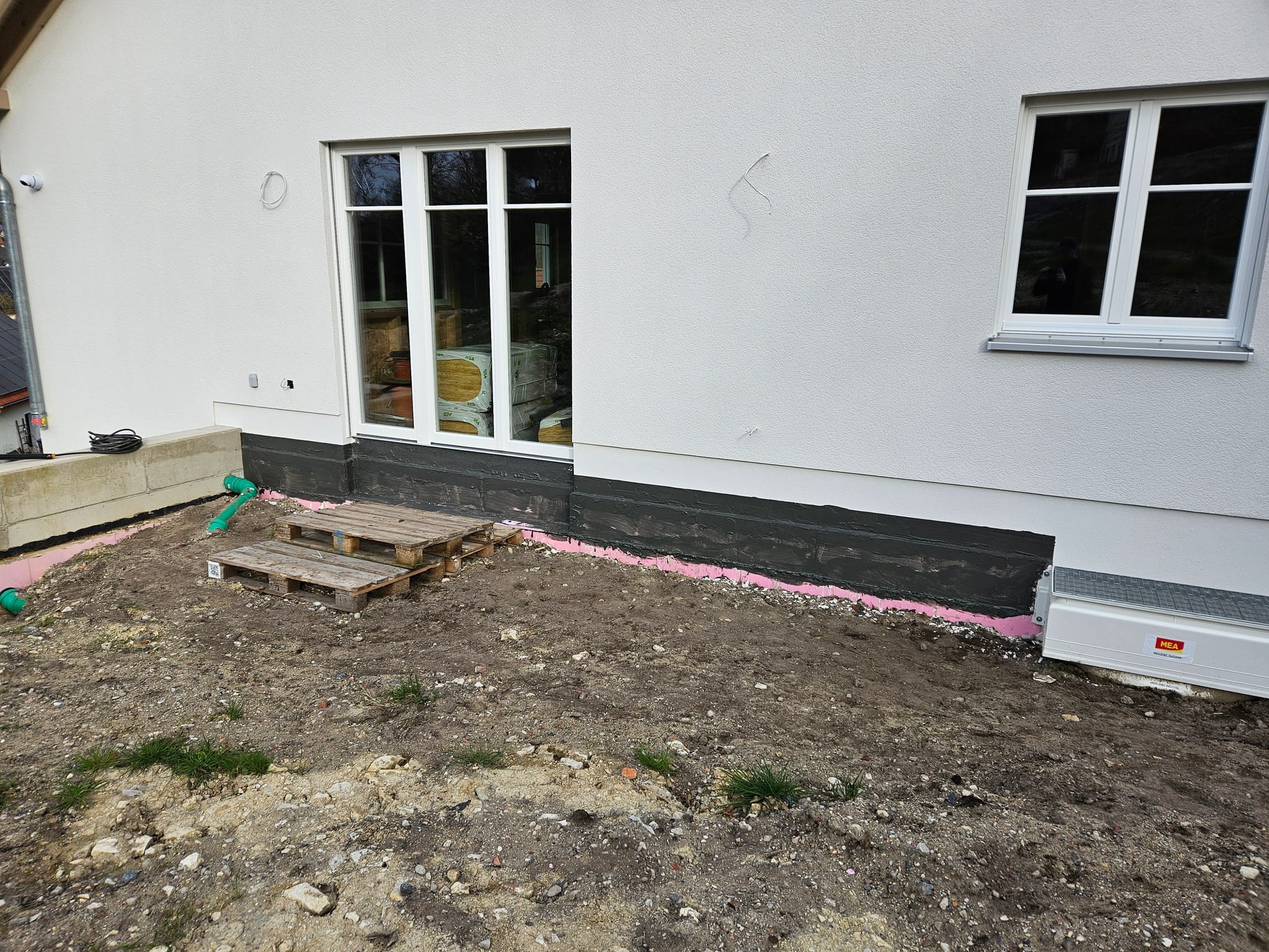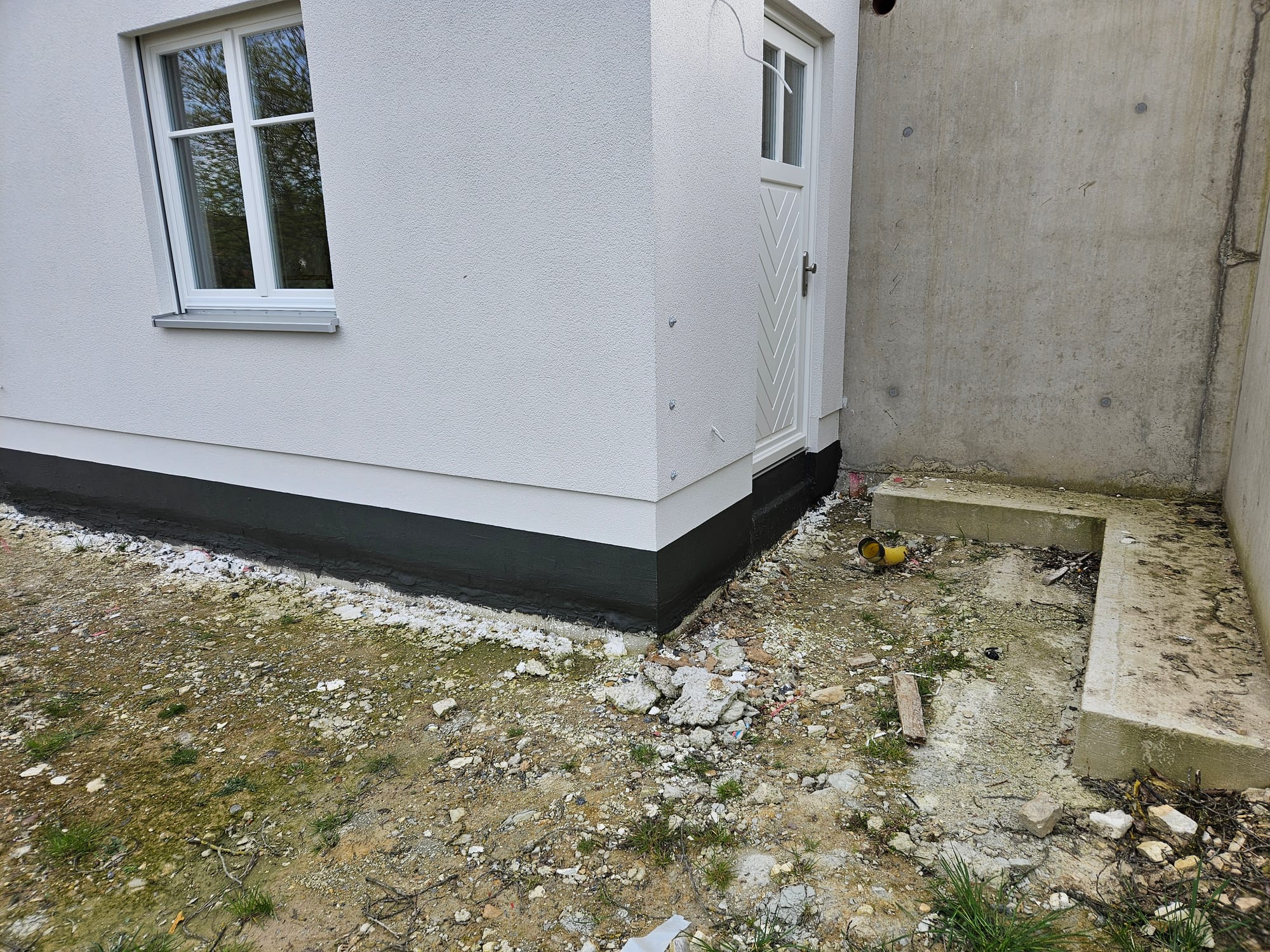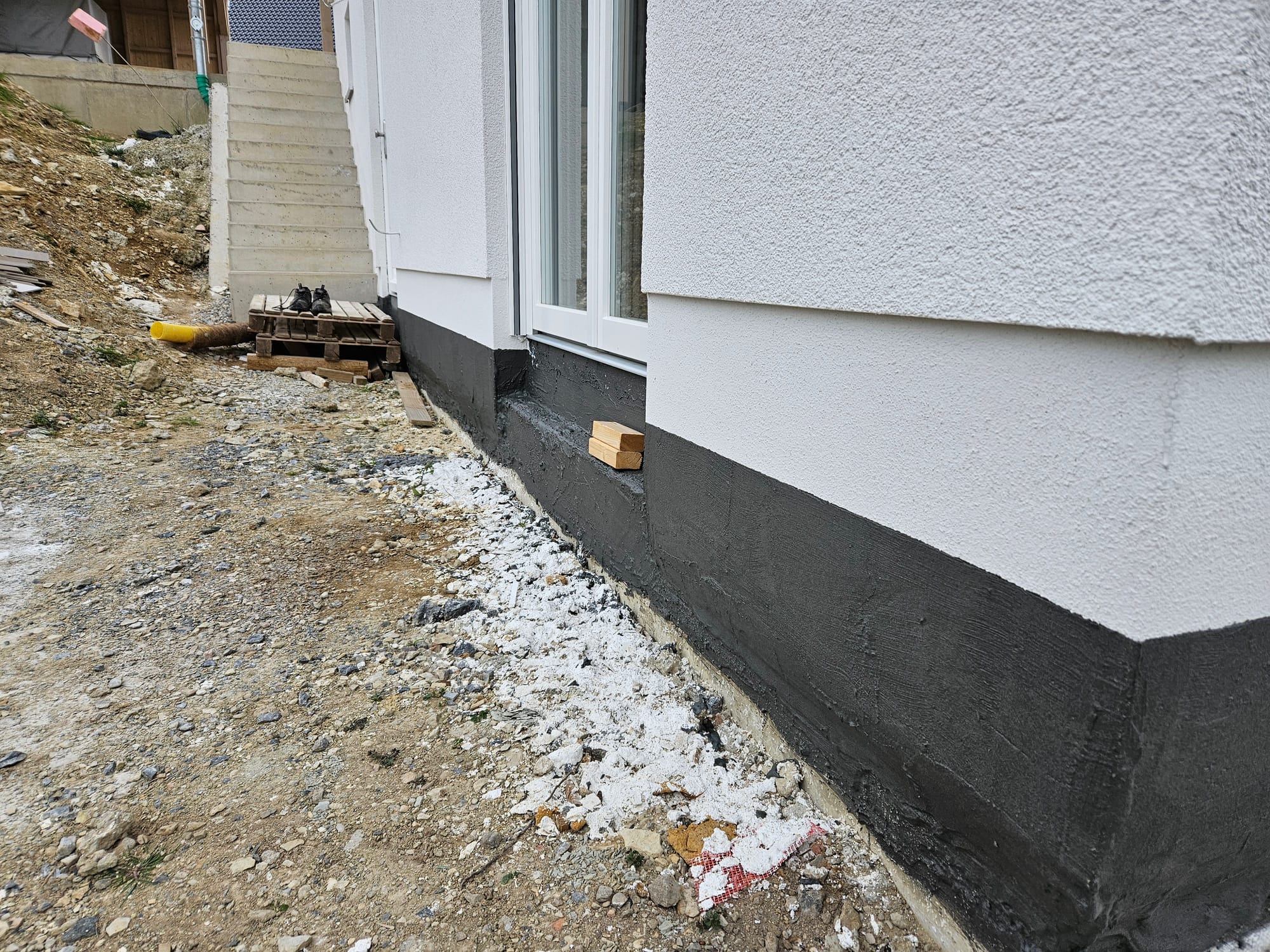 Wir dichten den Sockelputz ums ganze Haus ab.