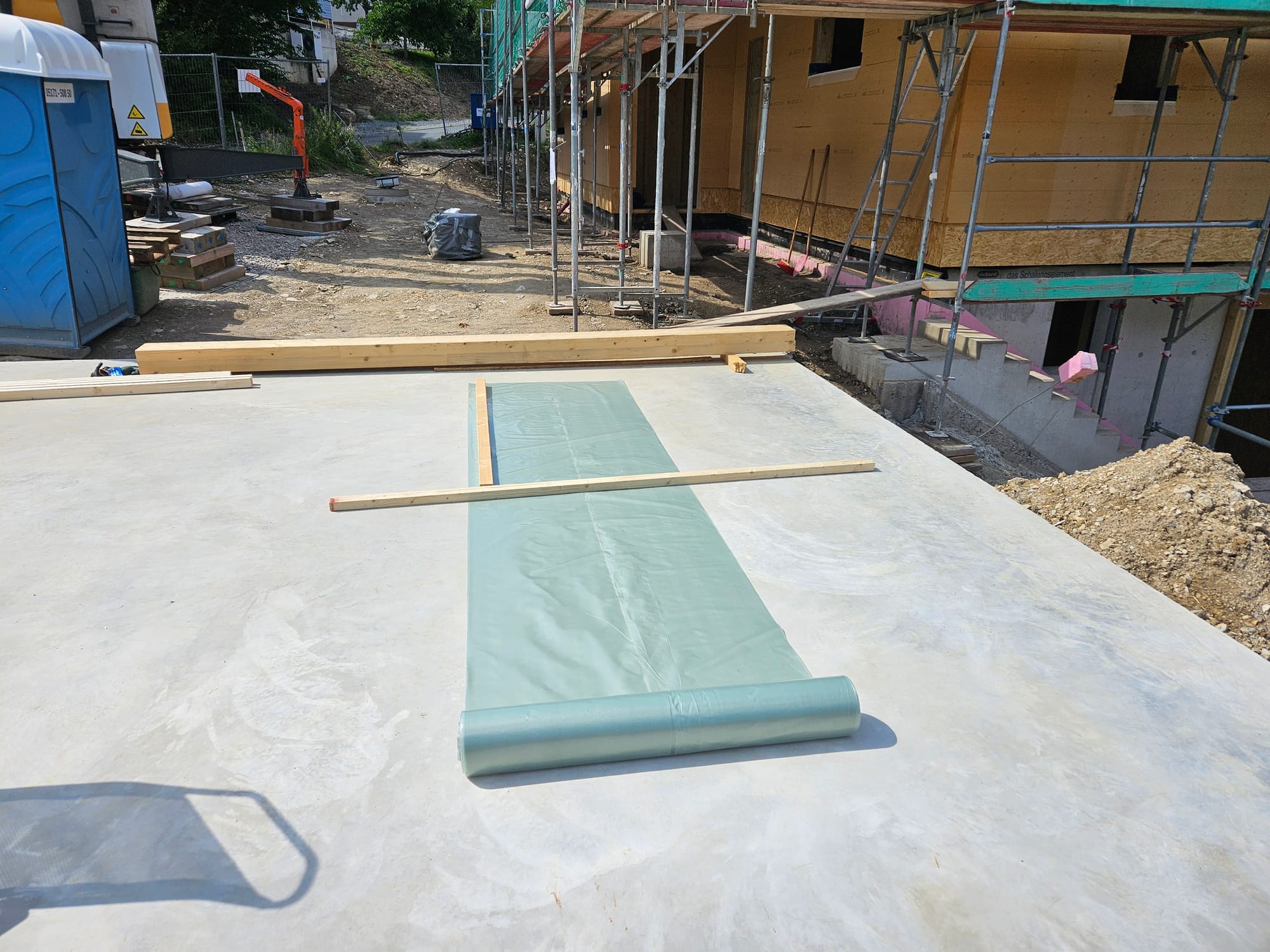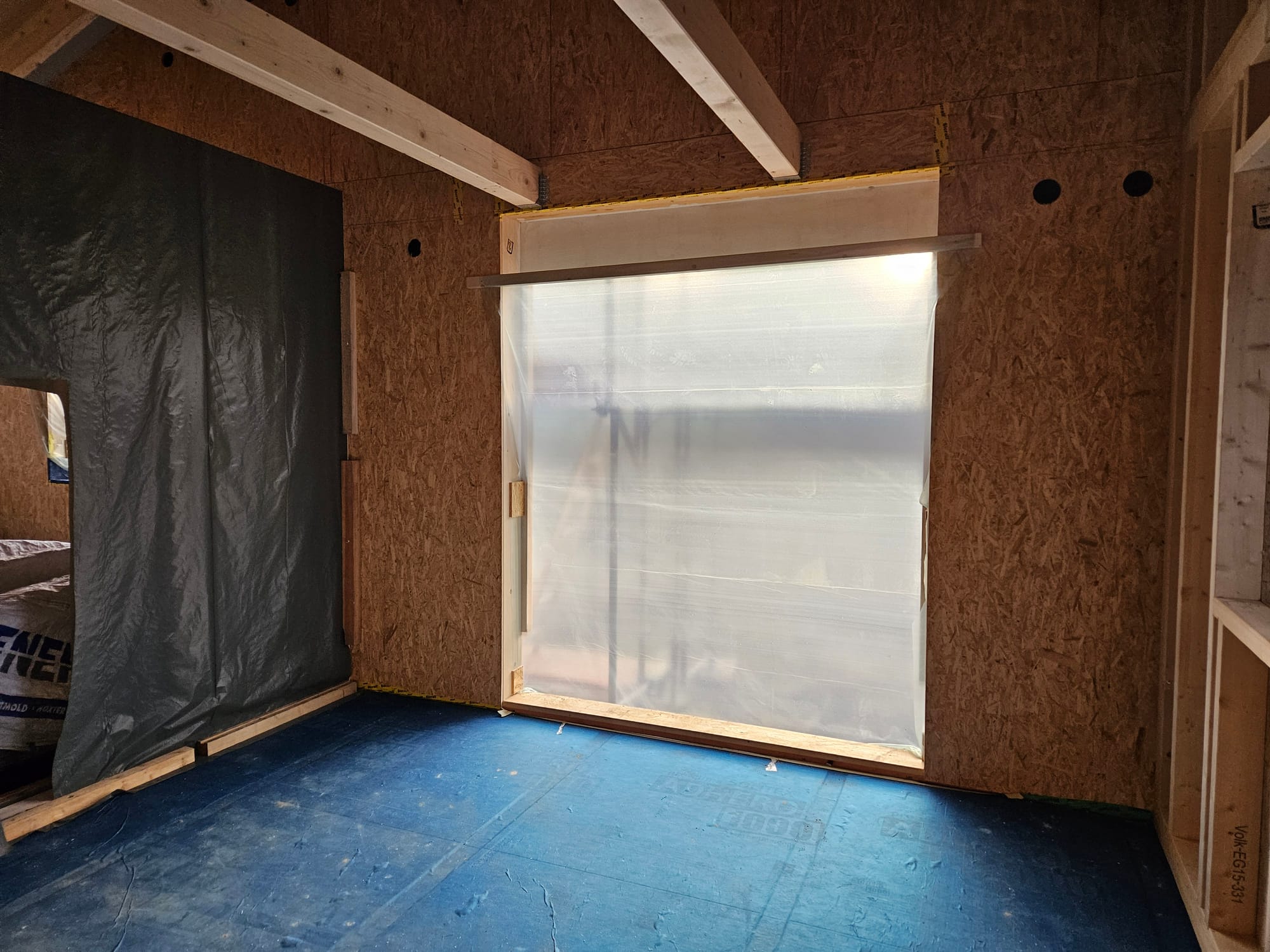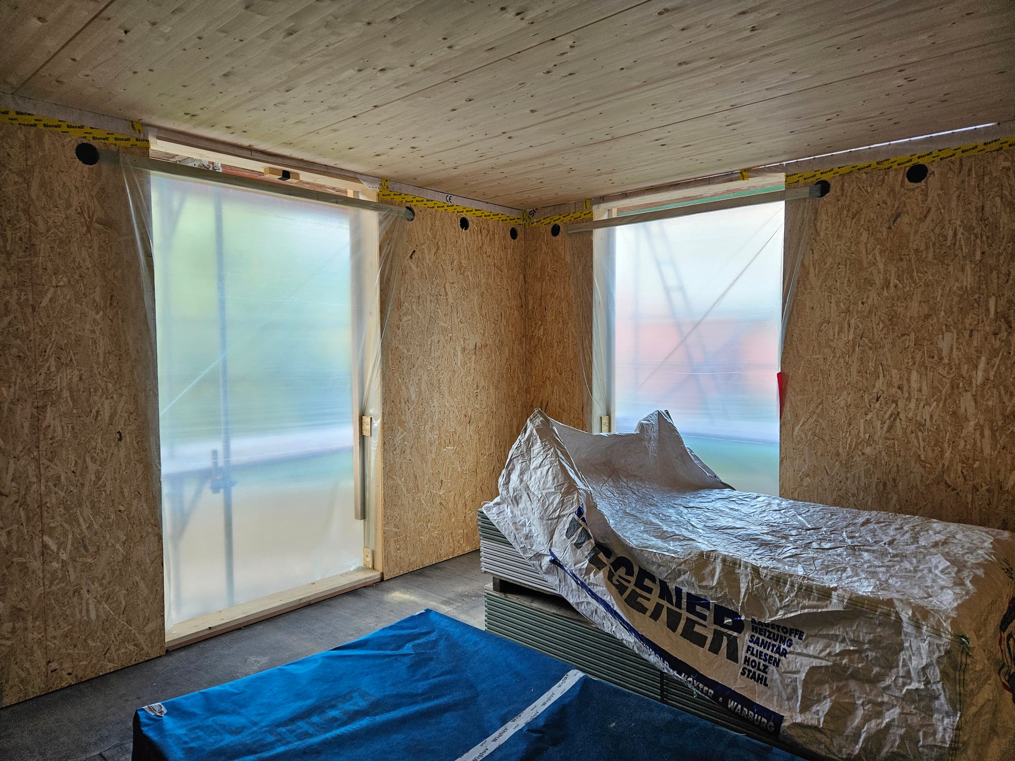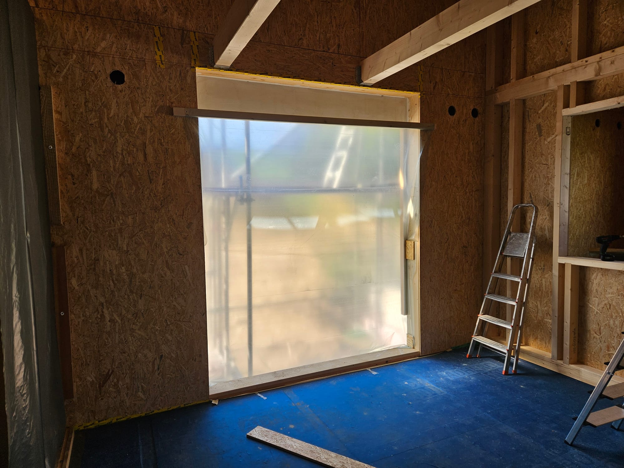 Wie streichen die Sparren des Carports und dichten alle Fenster mit Folie ab.