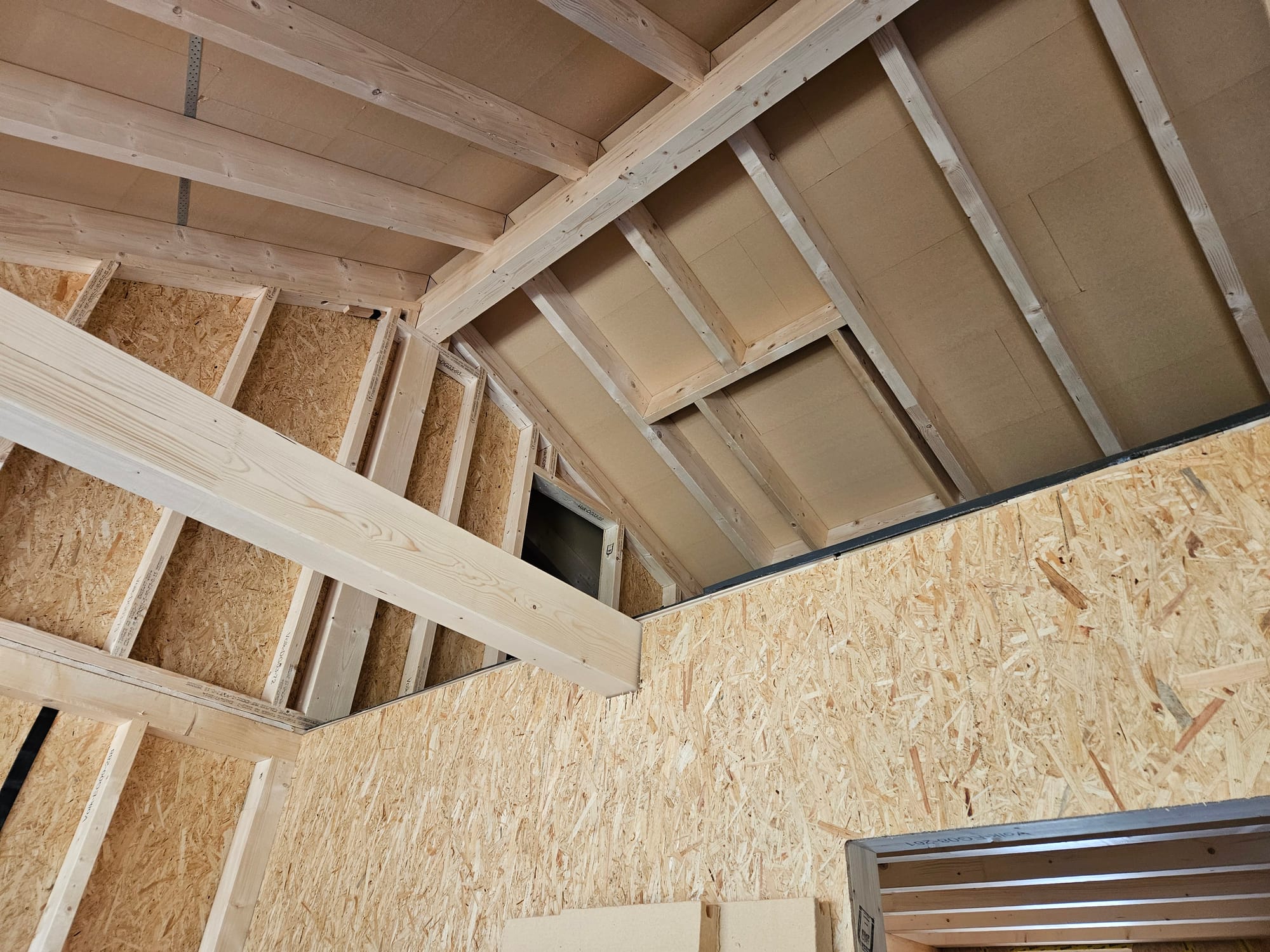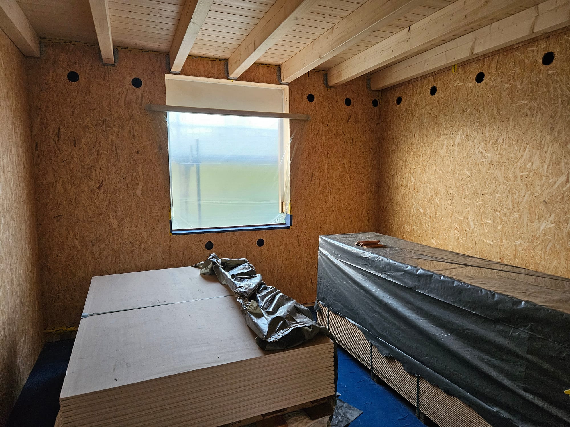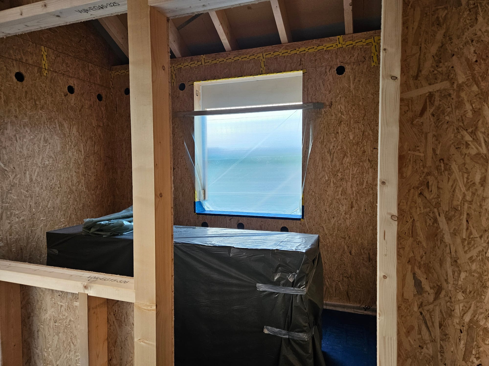 Wie streichen die Sparren des Carports und dichten alle Fenster mit Folie ab.