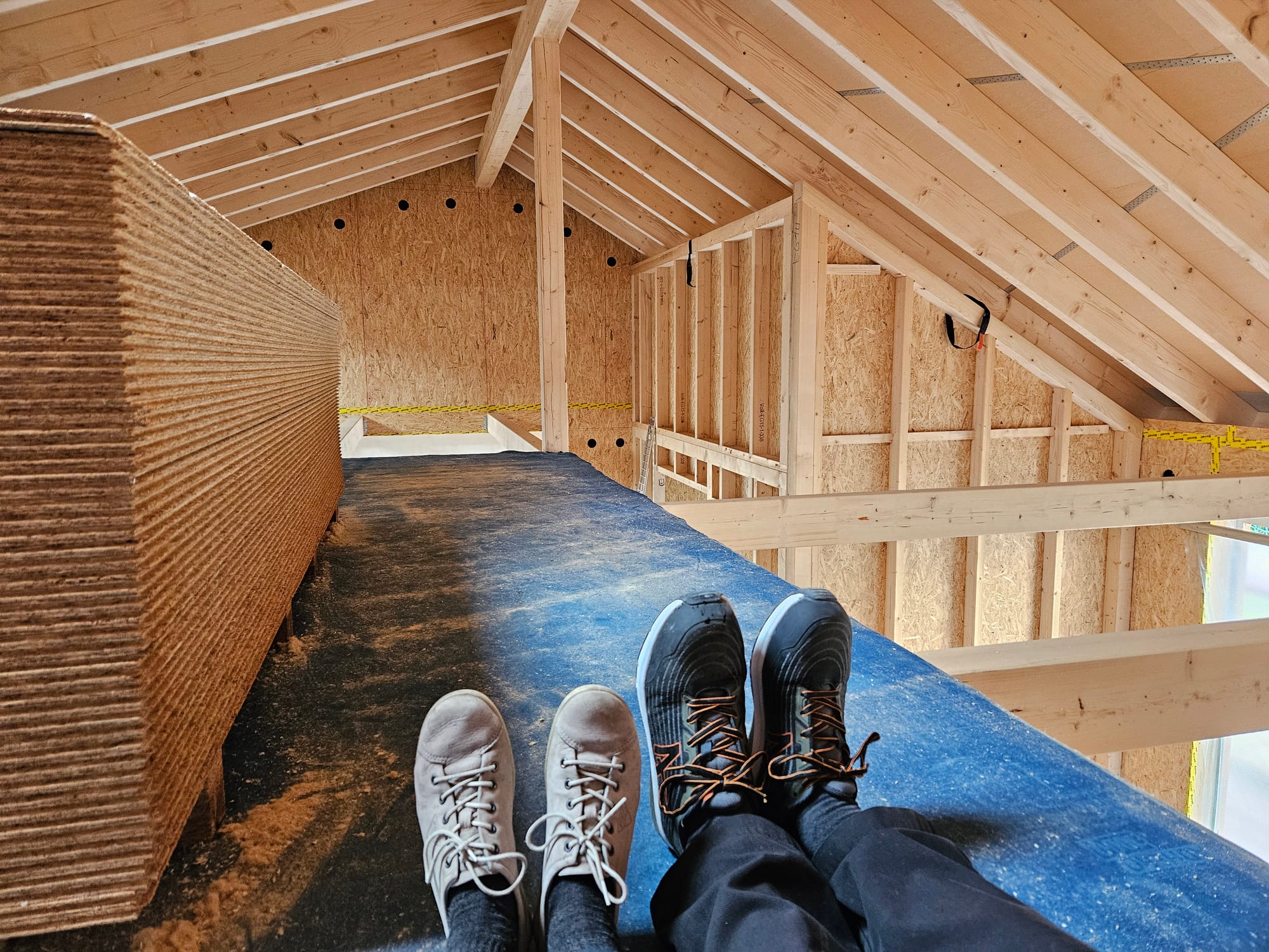 Es geht weiter. Was ist passiert? * Büro final Q2 gespachtelt * Gäste Decke zum 2. Mal lasiert * Keller grundiert * An der Holzfassade im Eingang wurde weiter gearbeitet Welche Firmen waren vor Ort? * Wir * Zimmerei Sonstiges * Sonstiges
