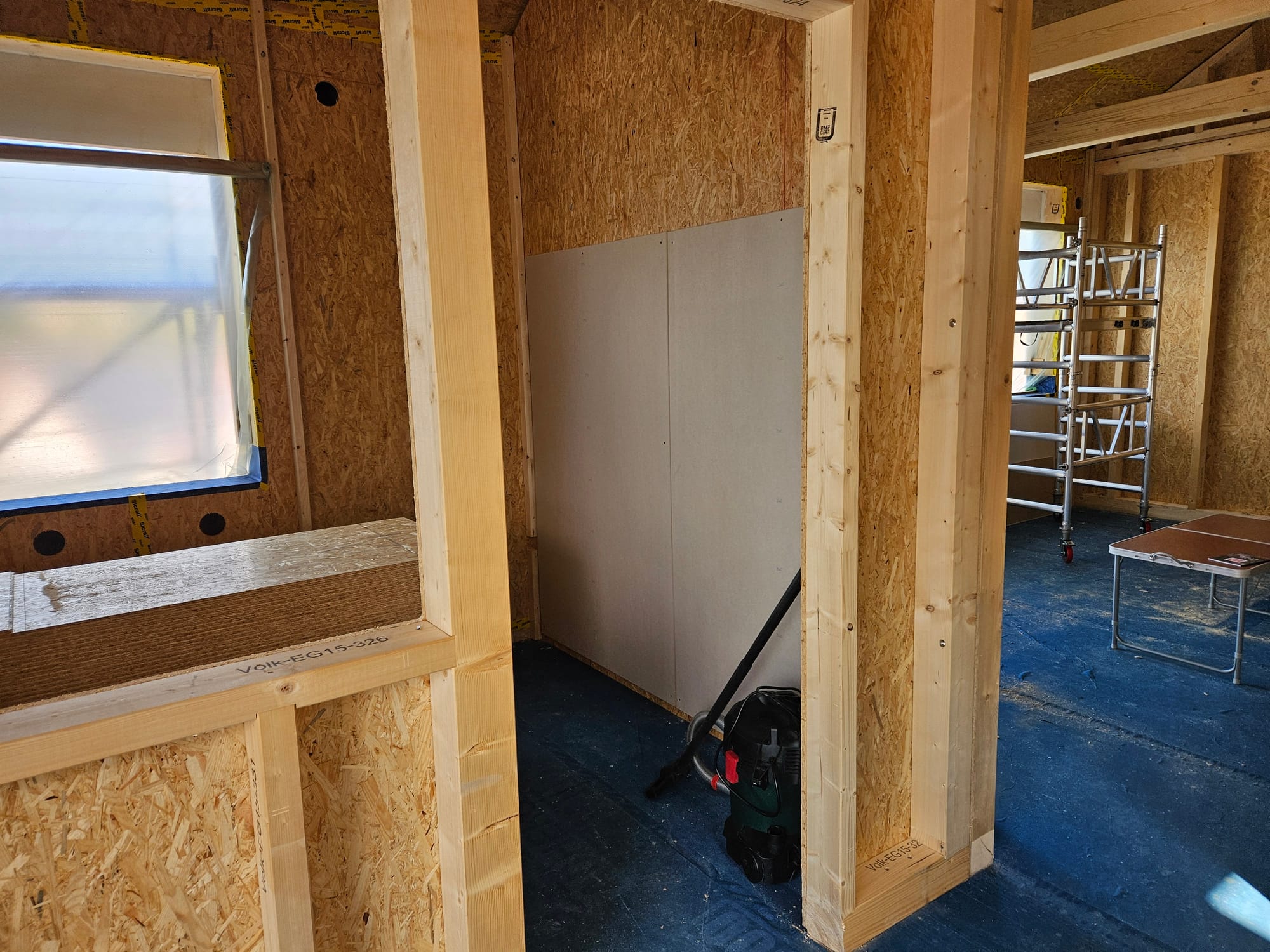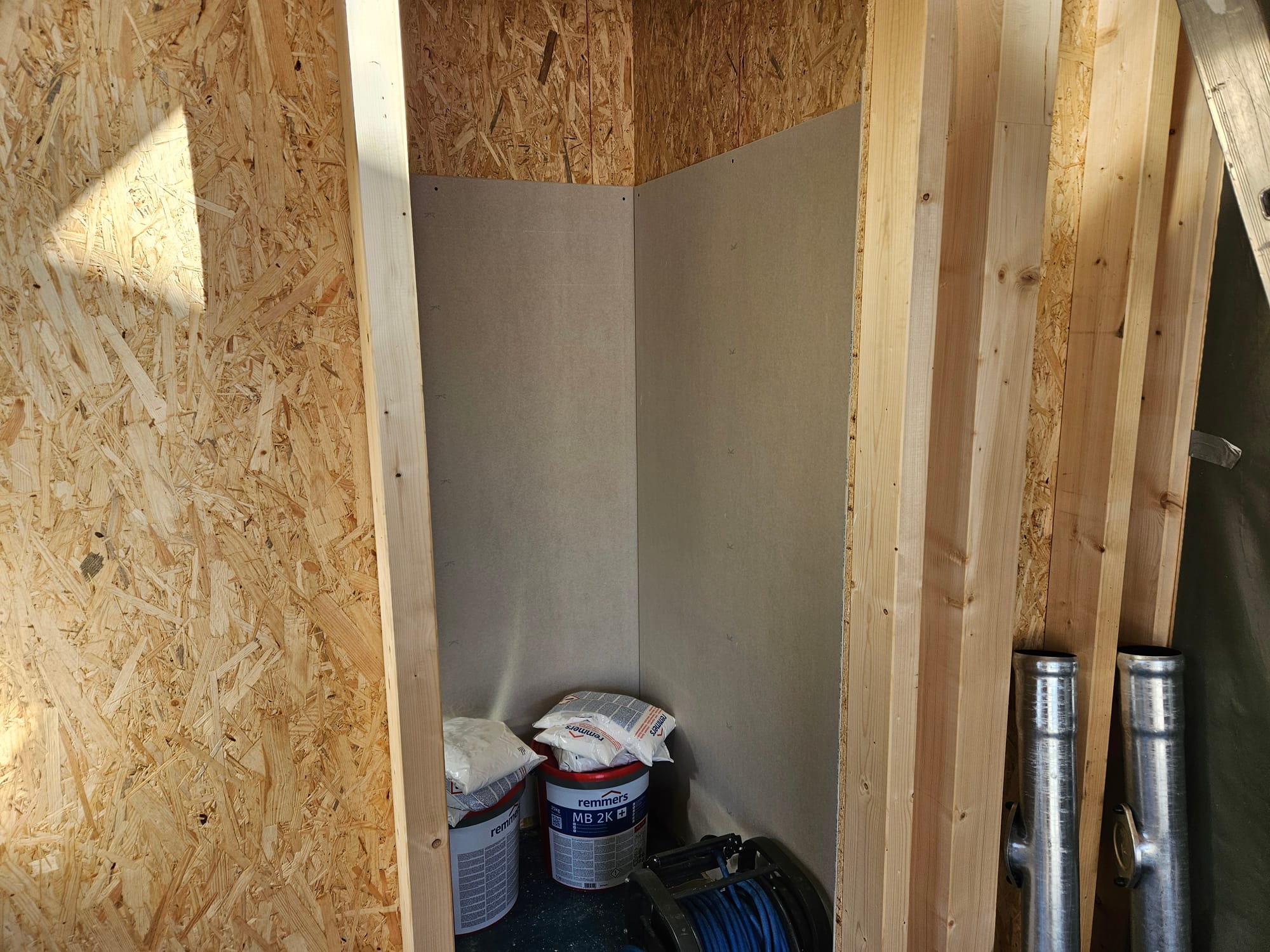Eine Palette Gipskartonplatten sind im weg und müssen umgesetzt werden. Wir schrauben die ersten Platten an die Wand.