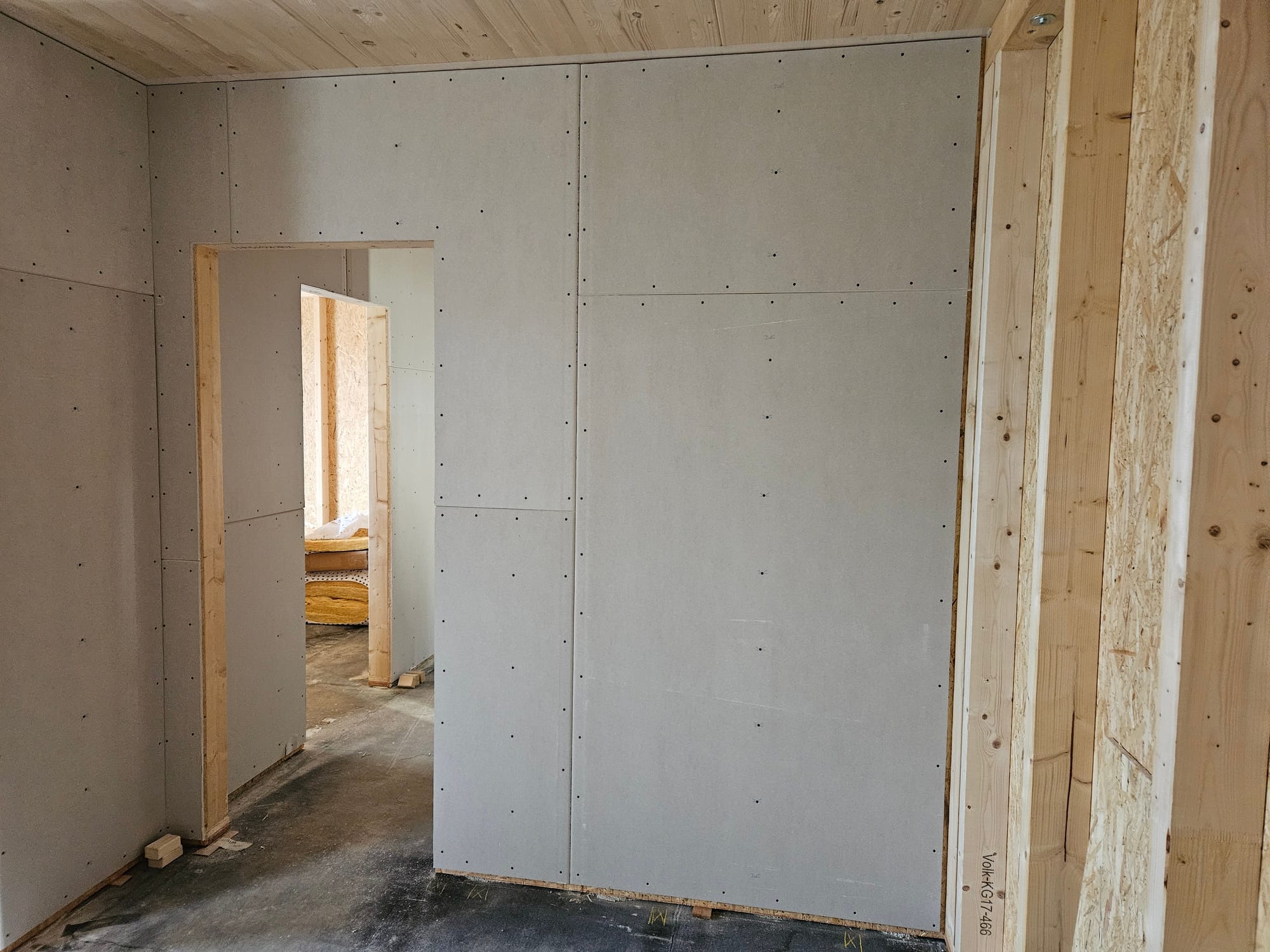 Wir streichen den ersten Raum mit Lehmfarbe. Was ist passiert? * Gäste mit Lehmfarbe gestrichen * Büro final Q2 gespachtelt * Flur final Q2 gespachtelt * Waschküche Q1 gespachtelt * Außenfühler Heizung gebohrt Welche Firmen waren vor Ort? * Wir Sonstiges * Sonstiges