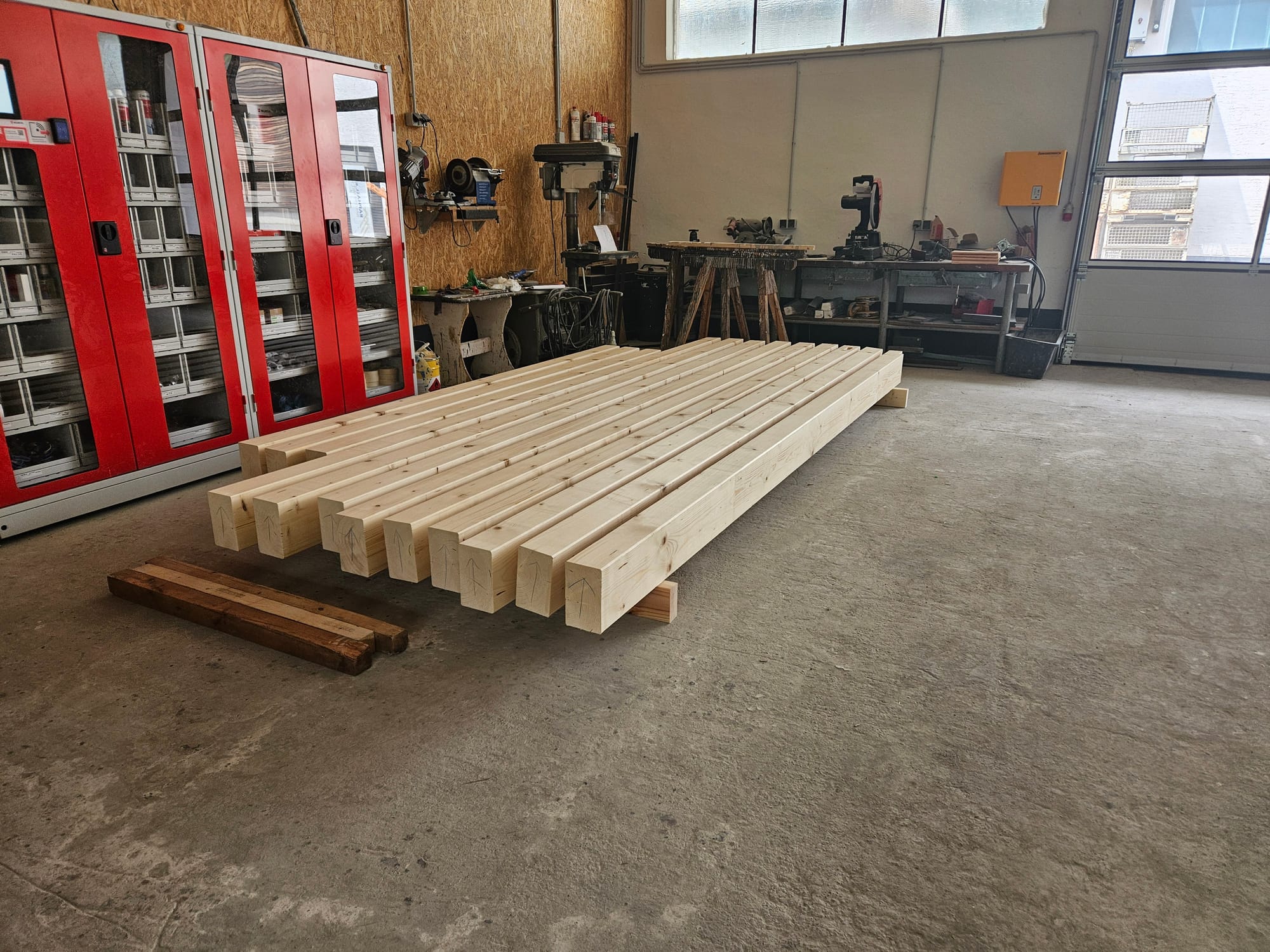 Es geht weiter. Was ist passiert? * Büro final Q2 gespachtelt * Gäste Decke zum 2. Mal lasiert * Keller grundiert * An der Holzfassade im Eingang wurde weiter gearbeitet Welche Firmen waren vor Ort? * Wir * Zimmerei Sonstiges * Sonstiges